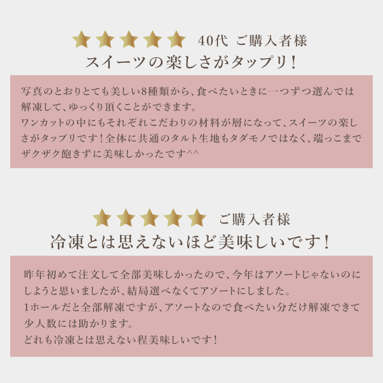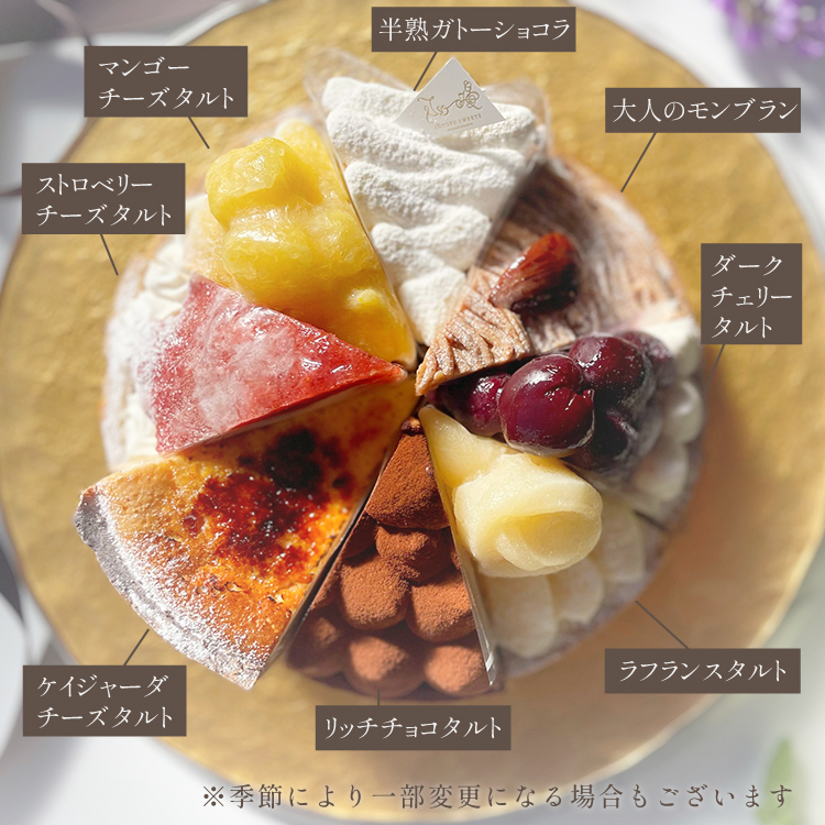 大口注文・法人のお問い合わせはこちら一度に8種を楽しめるパーティーアソートは ナイフもカットボードもいらない手軽さも人気のスイーツです。 ・完熟いちごのチーズムースタルト ・モンブラン好きさんのためのモンブランタルト ・なめらかケイジャーダチーズタルト ・贅沢完熟マンゴーチーズタルト ・5層で味わう大人のリッチチョコタルト ・贅沢ダークチェリータルト ・ラフランスのホワイトローズタルト ・じゅわりとろける濃密半熟ガトークラシック この8種類が1カットずつ入っています。 ※季節によって内容が変わる場合もございます※