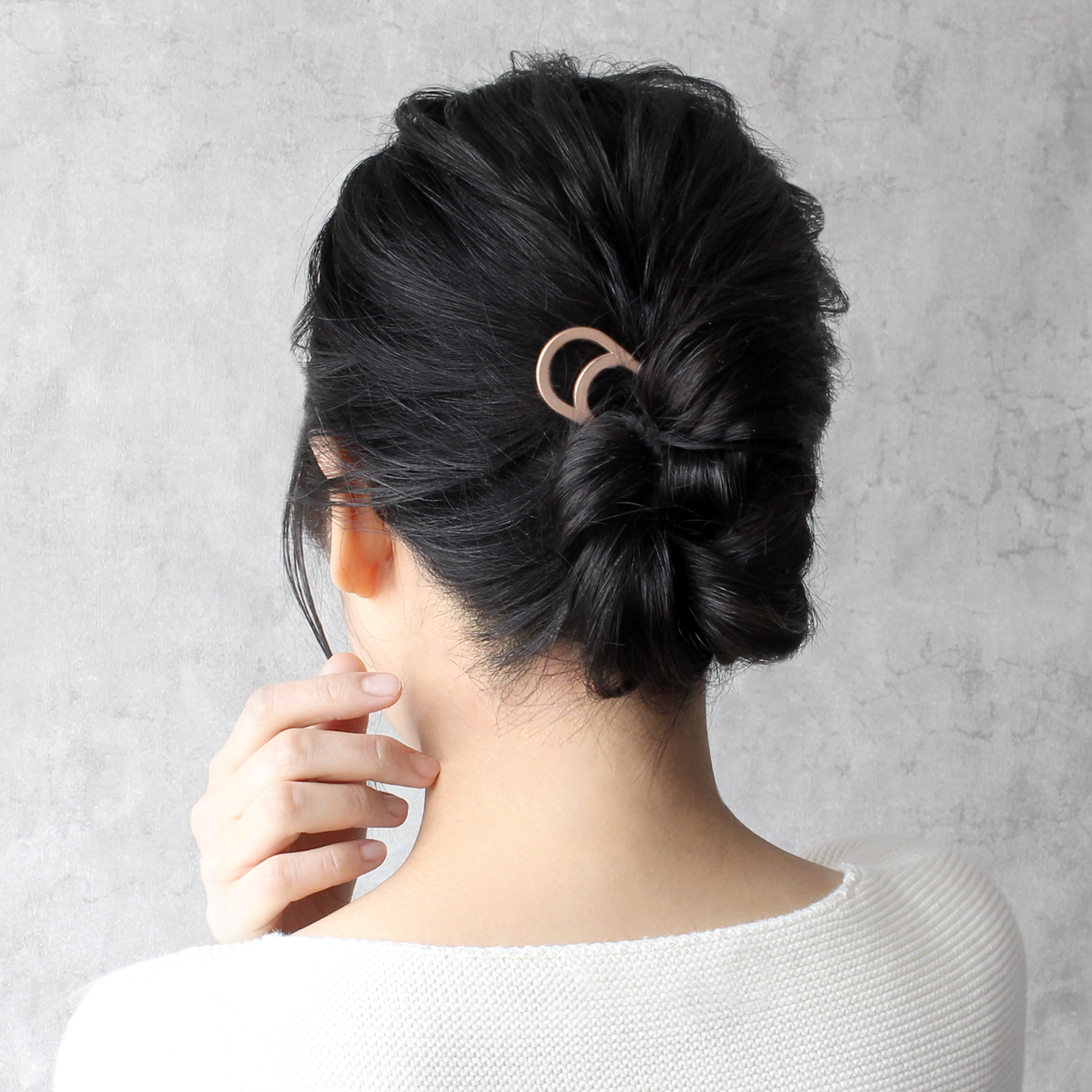 ヘアスタイリストの社員が研究した、こだわりの形状。 頭の形に沿ったカーブで、しっかりと頭にフィットします。 かんざしの足先も、肌を傷つけないよう丸みをつけています。 また、どこにも繋ぎ目がないので、折れてしまう心配もありません。 「髪にハリ・コシがあって、ヘアアクセサリーをすぐ壊してしまう」という方でも使いやすい、便利なアイテムです。