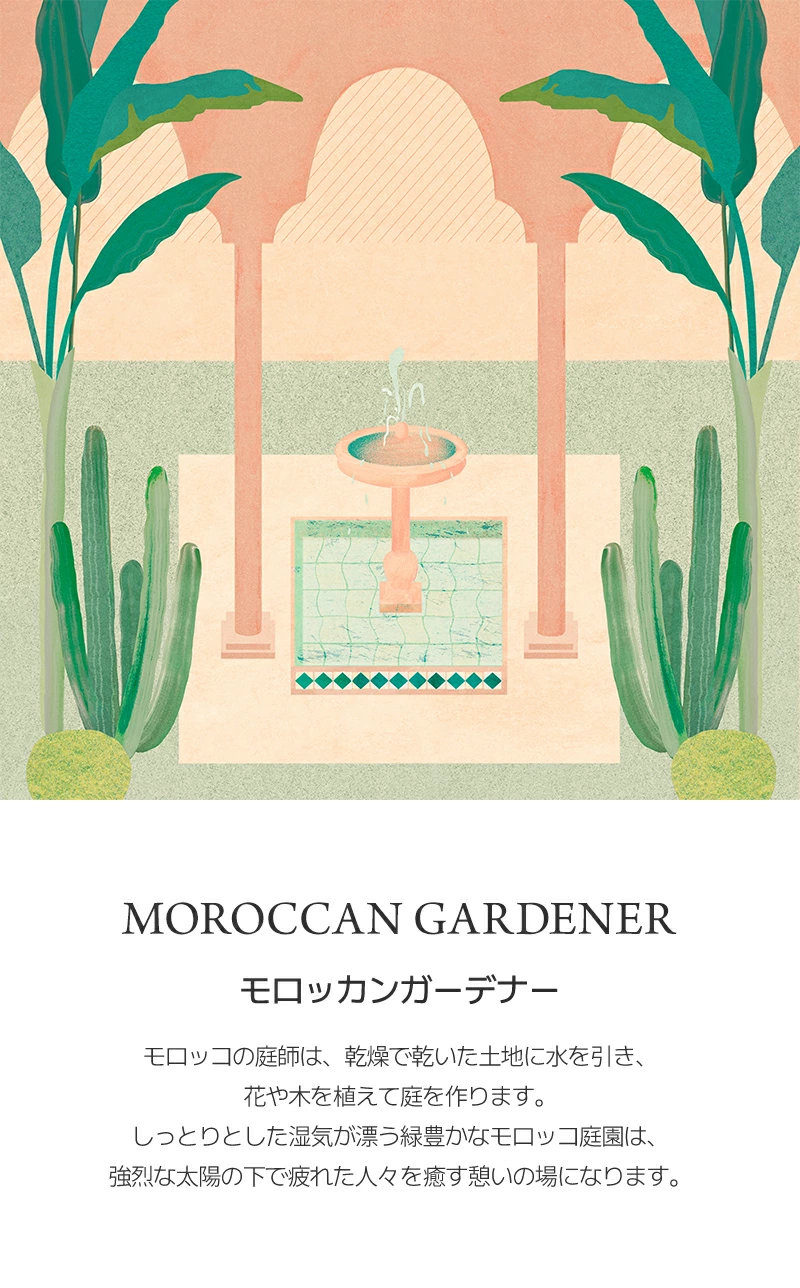 ハクスリーの商品すべてに共通する香りは、 豊かな緑を湛えた異国情緒あふれるモロッカンガーデンから インスピレーションを得た、上質でボタニカルなオリジナルの香り(シグネチャーセント)です。 TOP NOTE 露に濡れた新緑の新鮮な香り (凍結した湧き水、豊かな緑) MIDDLE NOTE 野花や木々を思い出させる庭園の香り (ジャスミン、ローズ、ユリ、クチナシ) BASE NOTE 心身をリラックスさせる温かみのあるホワイトムスク (ムスキー、パウダリー)