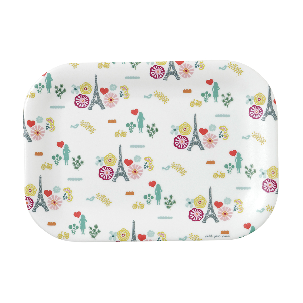 陶器のような高品質メラミン食器。特殊なコーティング加工によりキズがつきにくく、イラストの美しい発色とツヤ感が長期間続くのが特徴です。花とパリの風景をモチーフに、優しい色とタッチで描かれたデザインで、来客時のおもてなしなど、優雅なティータイムを演出してくれます。