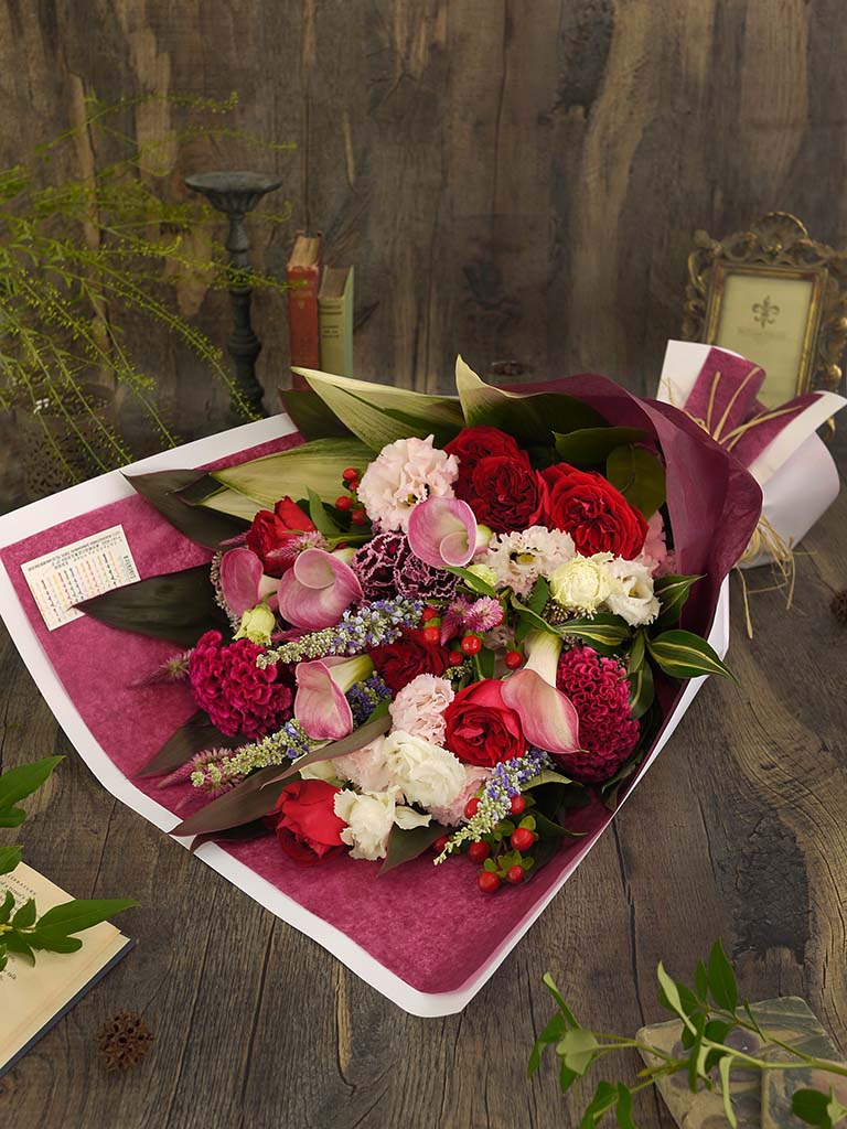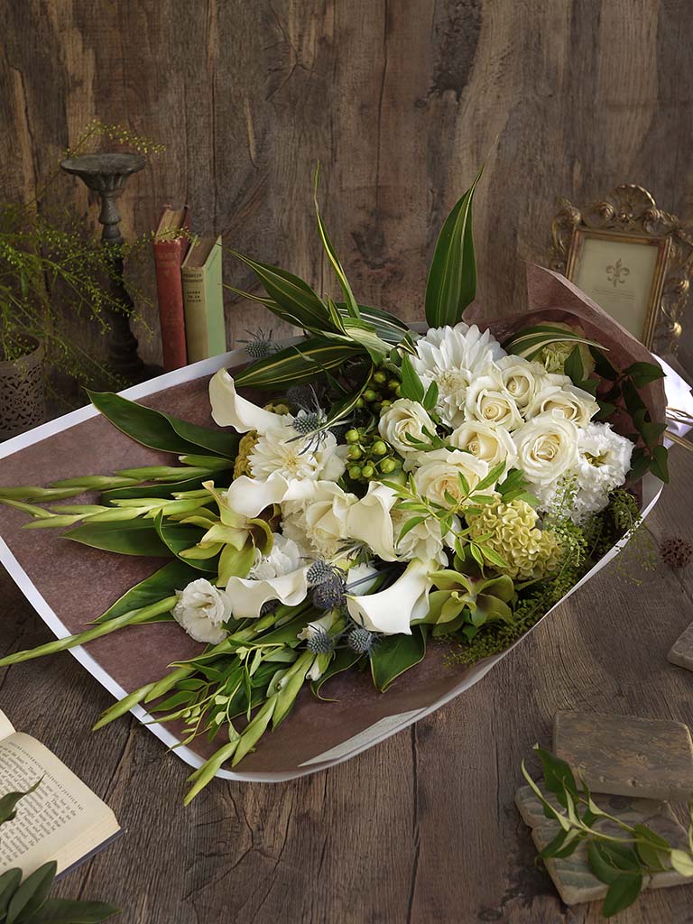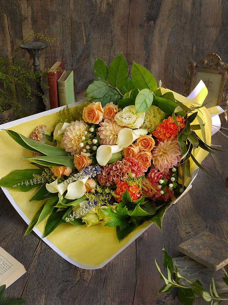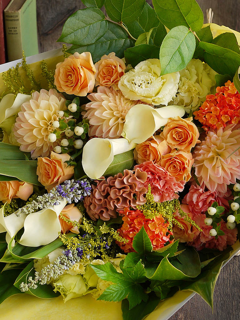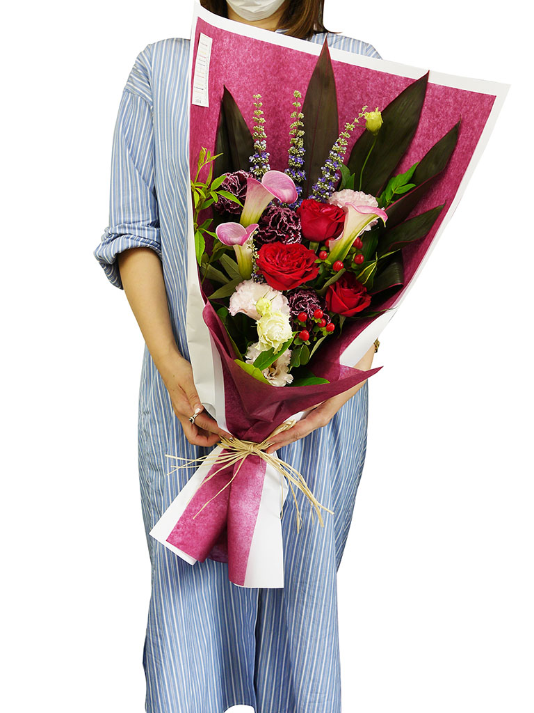 大口注文・法人のお問い合わせはこちらこの商品は、360度どこから見ても花の顔が見えるように束ねたブーケロン(丸いブーケ)とは違い、正面がある花束(ワンサイドブーケ)です。 丈が長くボリューム感がある花束なので、歓送迎会や発表会など、人前でお渡しする時などに華やかさを演出することができます。 花やグリーンの自然な流れを生かして、ざっくりと束ねたレ ミルフォイユ ドゥ リベルテのナチュラルなスタイルの花束は、花瓶に飾った時に様々な表情を見せてくれます。 <ブーケ(花束)のお手入れ方法> ラッピングを外し、ゼリー状の保水材の場合は洗い流してください。水に浸りそうな部分の葉は取り除き、清潔なハサミで茎を斜めにカットして活けてください。 空調・日光が直接当たる場所は避けて飾ってください。