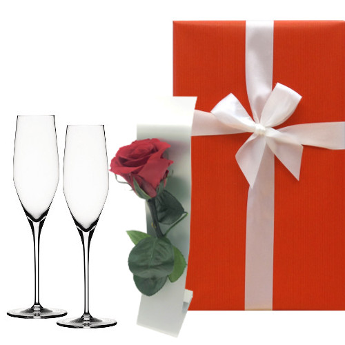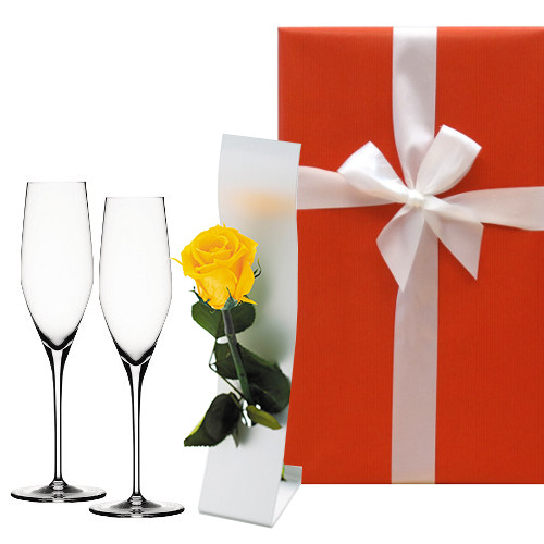 ドイツのグラスメーカー「シュピゲラウ社」のぺアシャンパングラスと、日本製のスタイリッシュな一輪挿しにバラのプリザーブドフラワーを組み合わせたギフトセットです。日本製の一輪挿しはどんな空間にも馴染む使いやすいサイズです。バレンタイン・結婚記念日・誕生日ギフトに♪