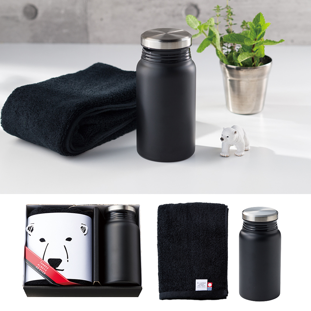 大口注文・法人のお問い合わせはこちらシンプルで吸水性に優れた今治タオルと、 二重構造で美味しい温度を保ち続けるサーモボトルのセットです。 スポーツやアウトドア好きの方へおすすめのギフトセットです。