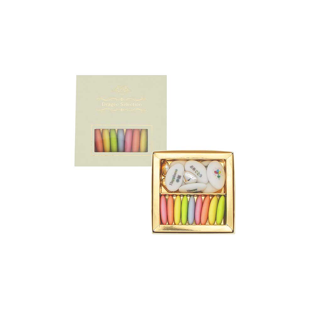 大口注文・法人のお問い合わせはこちらヨーロッパでは紀元前170 年代後半より 貴族の間で婚礼や出産などの慶事に祝い菓子として使用されており フランス語で「幸福の種」という意味もあるドラジェ。 アーモンド入りの白のドラジェには、ご結婚の祝福と、お二人のしあわせを願うメッセージをプリントしてお詰めしました。 それぞれに、 【Happy Wedding, おめでとう,Happiness(幸福),Health(健康) イラスト:BFF】 という思いを込めました。 ※BFF:Best Friend Foreverの略 「永遠の親友」を意味します。 パッケージの小窓からのぞくパステルカラーのドラジェは見た目にも華やかで、贈る方の笑顔も目に浮かびそう。 ご自分用としてはもちろんのこと、大切な方への手土産やパーティー用のプレゼントとしてもぴったりです。 パッケージのサイズやカラーバリエーション豊富なドラジェアソートボックスシリーズは、贈るシーンやお相手に応じて選ぶ楽しさもあり、お手軽な価格も人気の1つです。