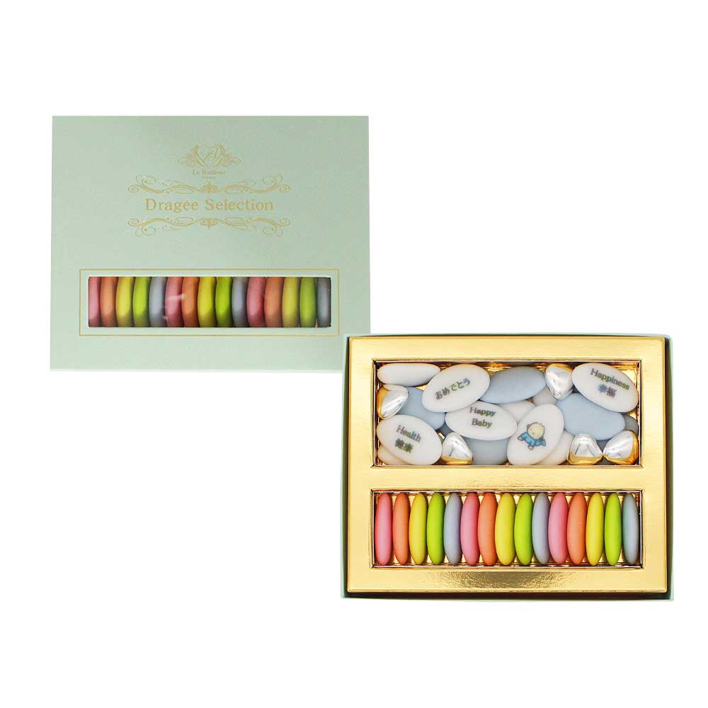 大口注文・法人のお問い合わせはこちらヨーロッパでは紀元前170 年代後半より 貴族の間で婚礼や出産などの慶事に祝い菓子として使用されており フランス語で「幸福の種」という意味もあるドラジェ。 パッケージの小窓からのぞくパステルカラーのドラジェは 見た目にも華やかで、贈る方の笑顔も目に浮かびそう。 アーモンド入りの白のドラジェには、ご出産の祝福と、ご家族のしあわせと健康を願う5種類のメッセージをプリントしてお詰めしました。 【メッセージ:Happy Baby, おめでとう, Happiness(幸福), Health(健康) イラスト:男の子】 ご自分用としてはもちろんのこと、 大切な方への手土産やパーティー用のプレゼントとしてもぴったり。 パッケージのサイズやカラーバリエーション豊富な ドラジェアソートボックスシリーズは、 贈るシーンやお相手に応じて選ぶ楽しさも!お手軽な価格も人気の1つ。