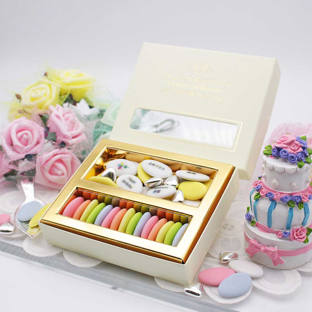 パッケージカラーも白をベースに キュートなパステル系カラーなど豊富な品揃えが魅力。 パッケージの小窓からのぞく5色のドラジェ(横詰め)が目を引くデザインに。 上質なフランス産ドラジェに合わせてパッケージにも金や銀の箔で刻印を施し、 蓋の内側にもドラジェのストーリーを刻印するなど、 食べた後もそばに置いておきたくなるくらい手の込んだつくりになっています。 無料オプションで「短冊熨斗」をお選びいただけます。