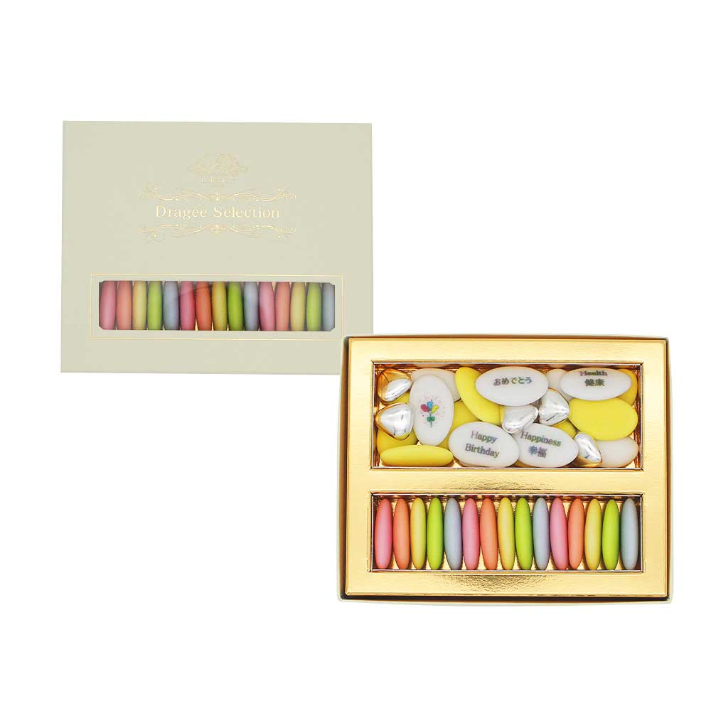 チョコレートや上質なイタリアのシチリア産アーモンドを 砂糖でコーティングしてつくるドラジェは、 カラフルなお色と甘すぎないチョコレートがくせになるお味です。 贈る方への「しあわせ」や「健康」を願う意味も込めて ドラジェにメッセージやキュートなイラストをプリントを施しました。 「祝い菓子」としてのドラジェを一層 意味のある贈り物にしたいという思いが詰まった一品です。 日持ちも長く(お届け後120日保証)、 かさもはらないのでパーティの手土産やプレゼントにも最適です。 国産ドラジェにはない上質な味わい。 日本の品質・安全基準に合わせて オリジナルの着色料を使用してつくられたドラジェです。 チョコレート菓子ですが、表面を砂糖コーティングしているため 中のチョコレートが溶けだすことなく通年で常温配送可能です。 ※まれにドラジェに割れが生じることもありますが品質に問題はございません