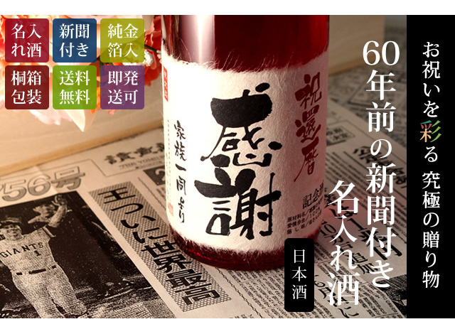 メモリアル新聞が付いた名入れの日本酒です。ご指定いただいた日付の、朝刊一面と20年間の青春年表が両面に印刷されています。日本酒は新潟県産の金箔入り純米大吟醸酒で、フルーティで奥深い味わいが楽しめます。ラベルもオリジナルでまさに特別な贈り物に最適の一品です。