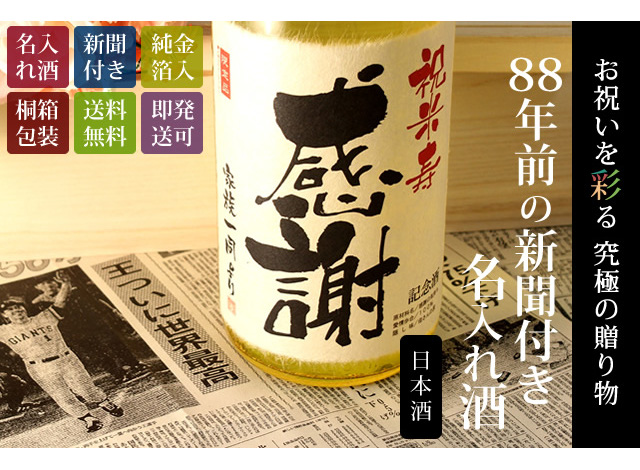 メモリアル新聞付きの名入れ日本酒です。ご指定いただいた日付の、朝刊一面と20年間の青春年表が両面に印刷されています。日本酒は新潟県産の金箔入り純米大吟醸酒で、フルーティで奥深い味わいが楽しめます。お祝いの贈り物に最適の一品です。