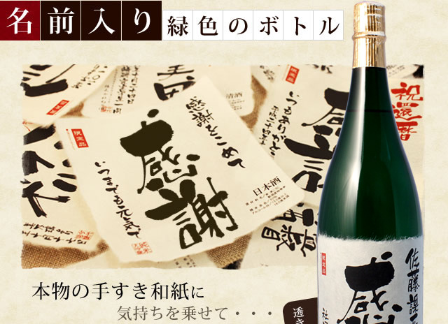 大口注文・法人のお問い合わせはこちら職人が染め上げた緑色に透き通る一升瓶と、職人が精魂込めて造り上げた本物の手すき和紙にあなたからの気持ちを乗せてお届けします。 そう、そのお酒はどこにも売ってない、世界でたったひとつだけ。
