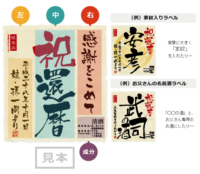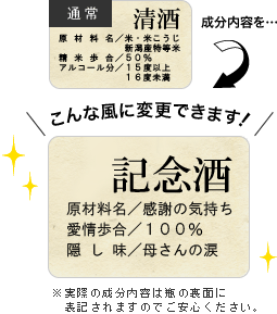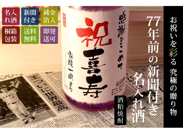 初めておじいちゃんになった日、お父さんが過ごしたあの頃の思い出。 お母さんと出会い、過ごした日々。 いつかの人生のあの瞬間。 お父さんが生まれた日は何があった? 私が生まれた日は? そんな会話が聞こえてきそうな“メモリアル新聞”を添えて、 オンリーワンのお酒とともに最高の演出をいたします。