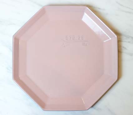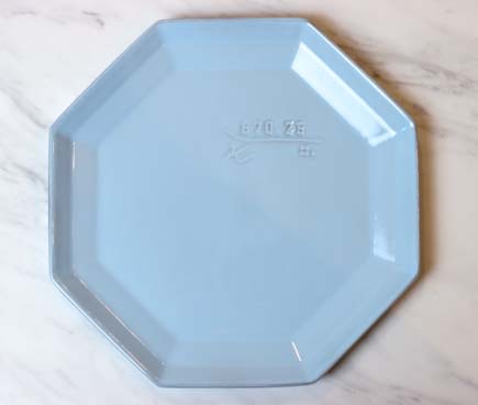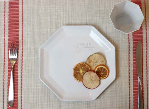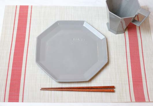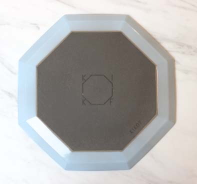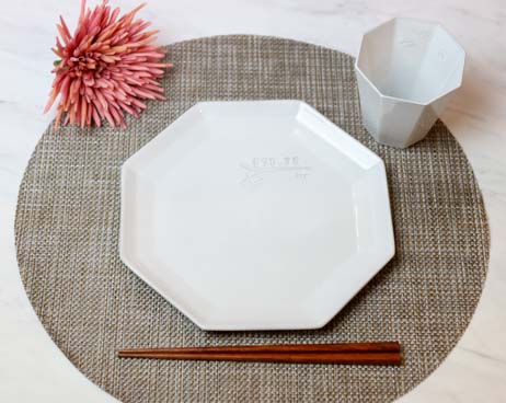 デザインにこだわり、職人がひとつひとつ丁寧につくった信楽焼のプレートです。琵琶湖の素朴であたたかい土を使用していて、紙の薄さを表現することや八角形を保つために試行錯誤を重ねました。陶器にしか表現できない色彩が特徴的で、色の名前は琵琶湖の朝、昼、夕、月夜の琵琶湖の湖面をイメージしています。