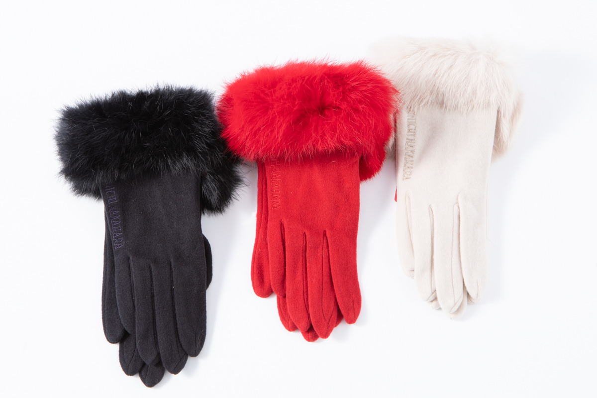 環境に優しく毛玉になりにくいアクリルテンセル使用のファー付き手袋。手元のファッションに一気に彩りを与えられます。
