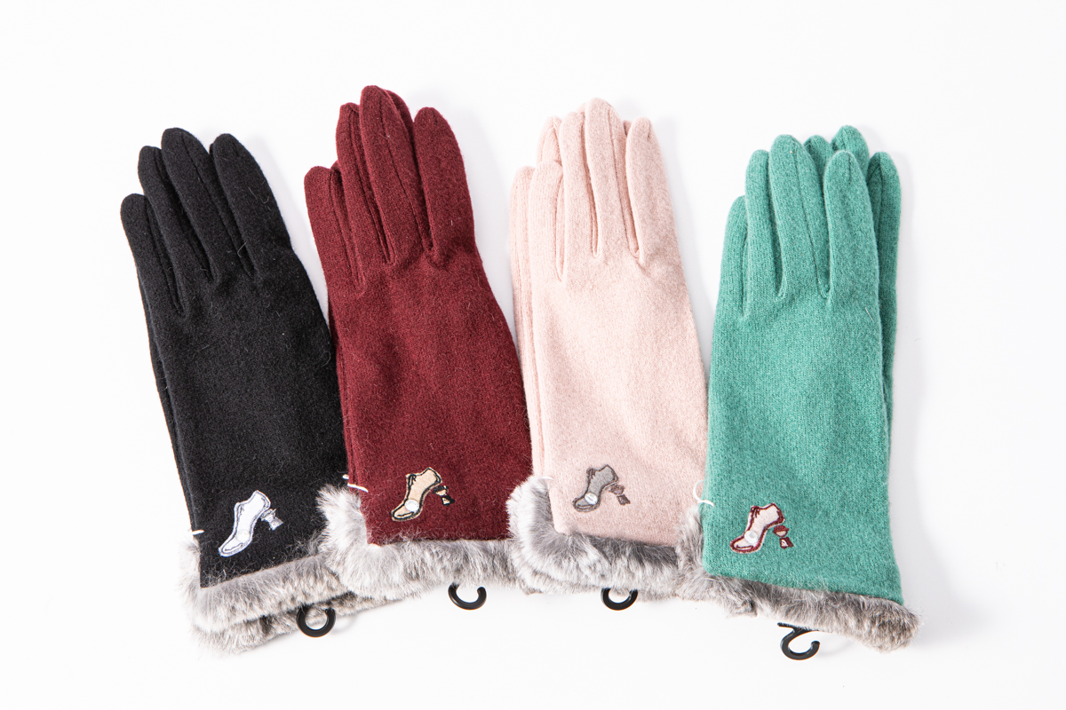 大口注文・法人のお問い合わせはこちらハイヒールとクラッチバッグのアップリケがかわいらしい手袋です。 手元にはラビットのファーがあしらわれておりゴージャス感も演出しています。