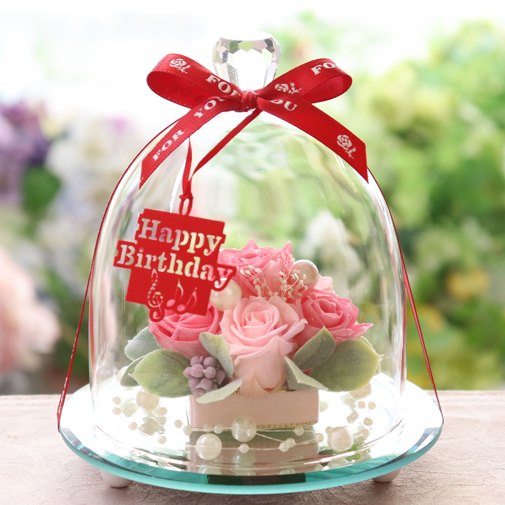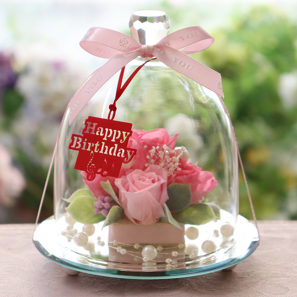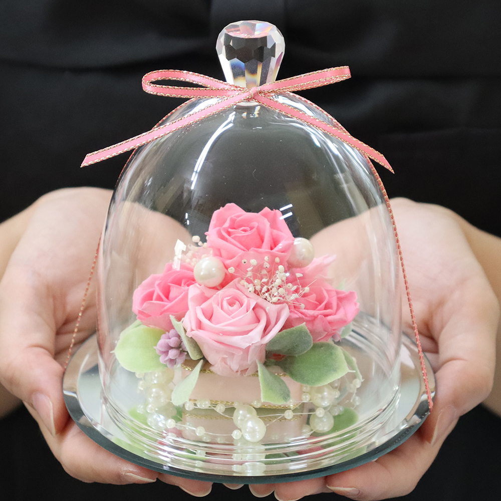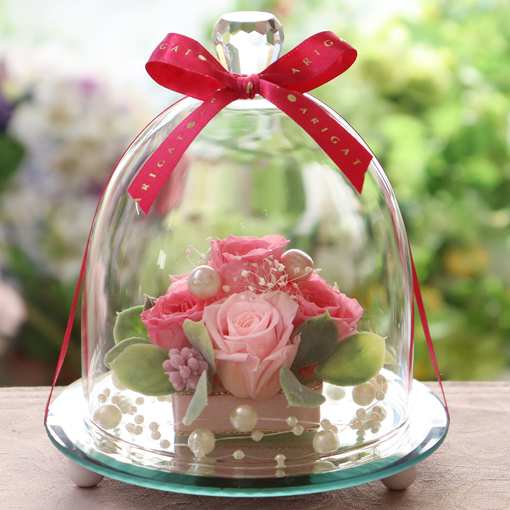 ラグジュアリーな雰囲気が漂うガラスベル。ガラスドームのトップにはクリスタルカットのピジューが輝きます。プリザーブドフラワーは水やりの必要がなく、半年~1年は充分綺麗な状態で楽しめます。お部屋に置いても可愛く、花粉も飛ばないため誕生日など特別な日の贈り物としておすすめです。