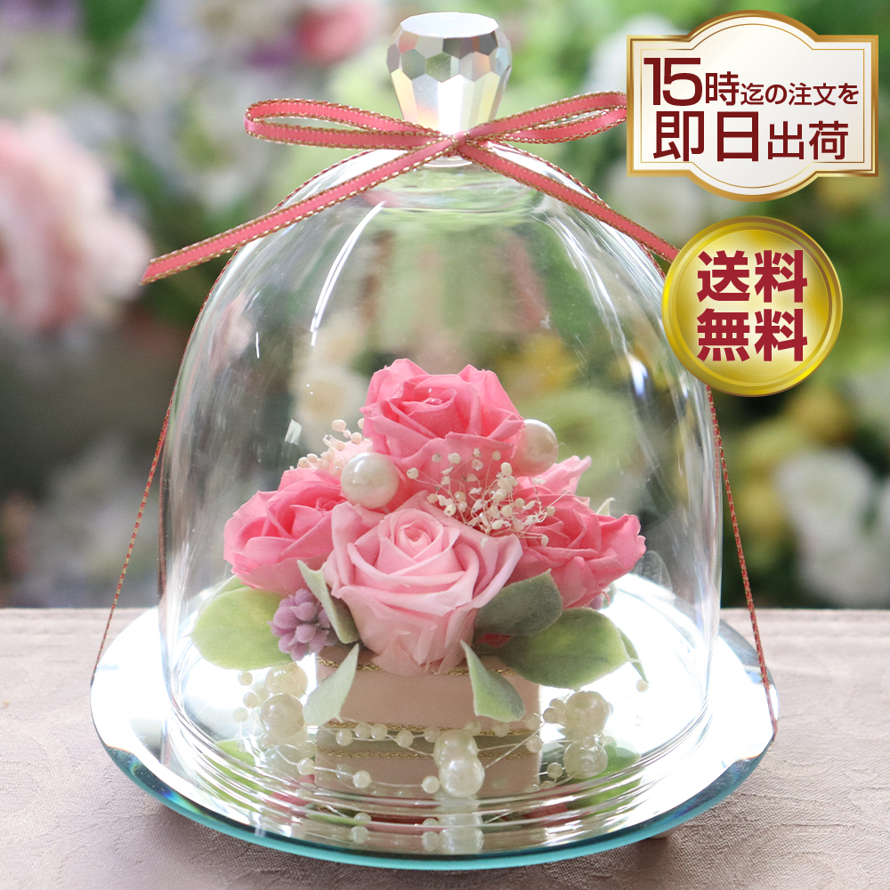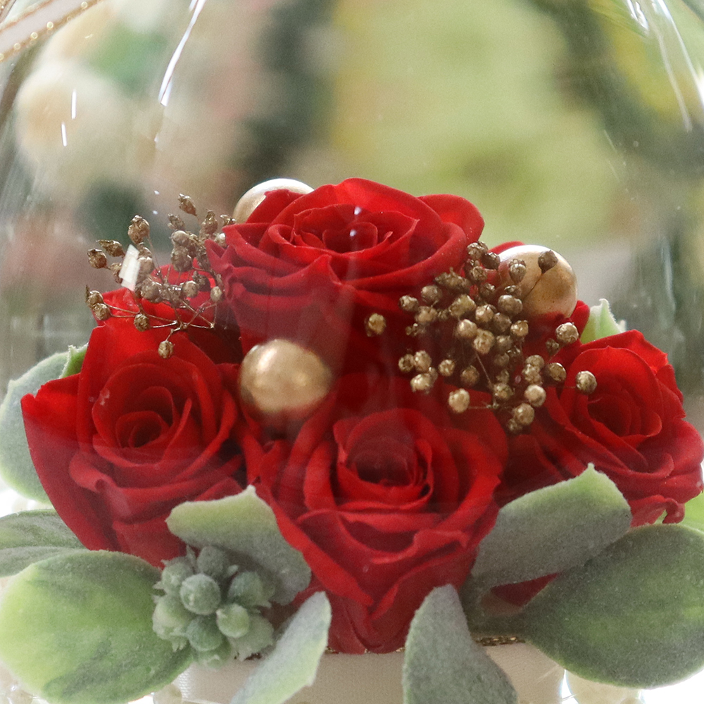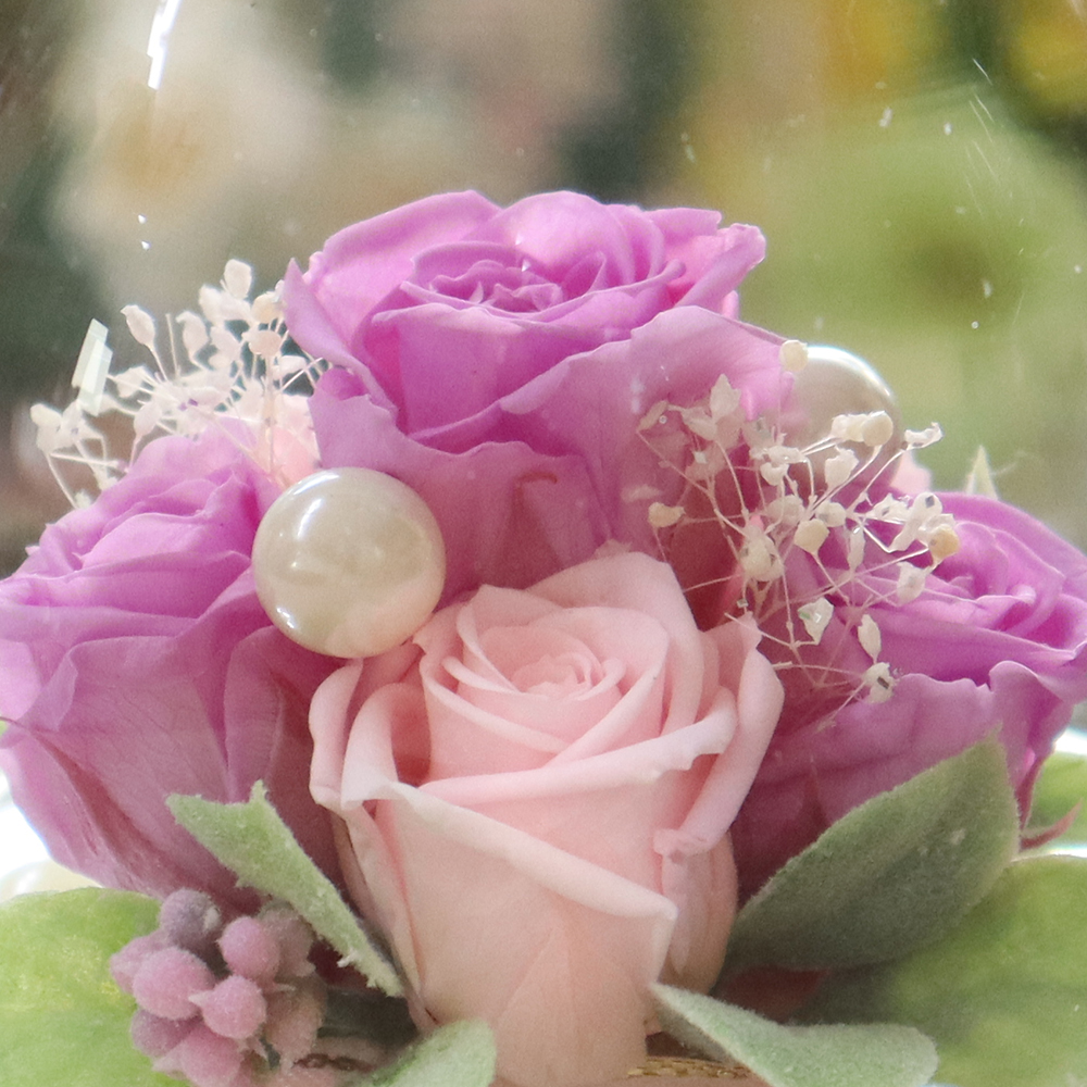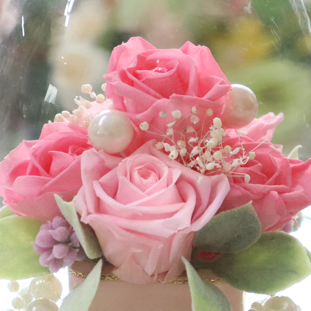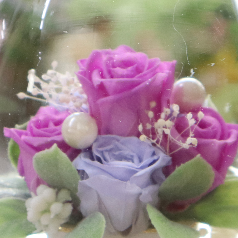 ラグジュアリーな雰囲気が漂うガラスベル。ガラスドームのトップにはクリスタルカットのピジューが輝きます。プリザーブドフラワーは水やりの必要がなく、半年~1年は充分綺麗な状態で楽しめます。お部屋に置いても可愛く、花粉も飛ばないため誕生日など特別な日の贈り物としておすすめです。