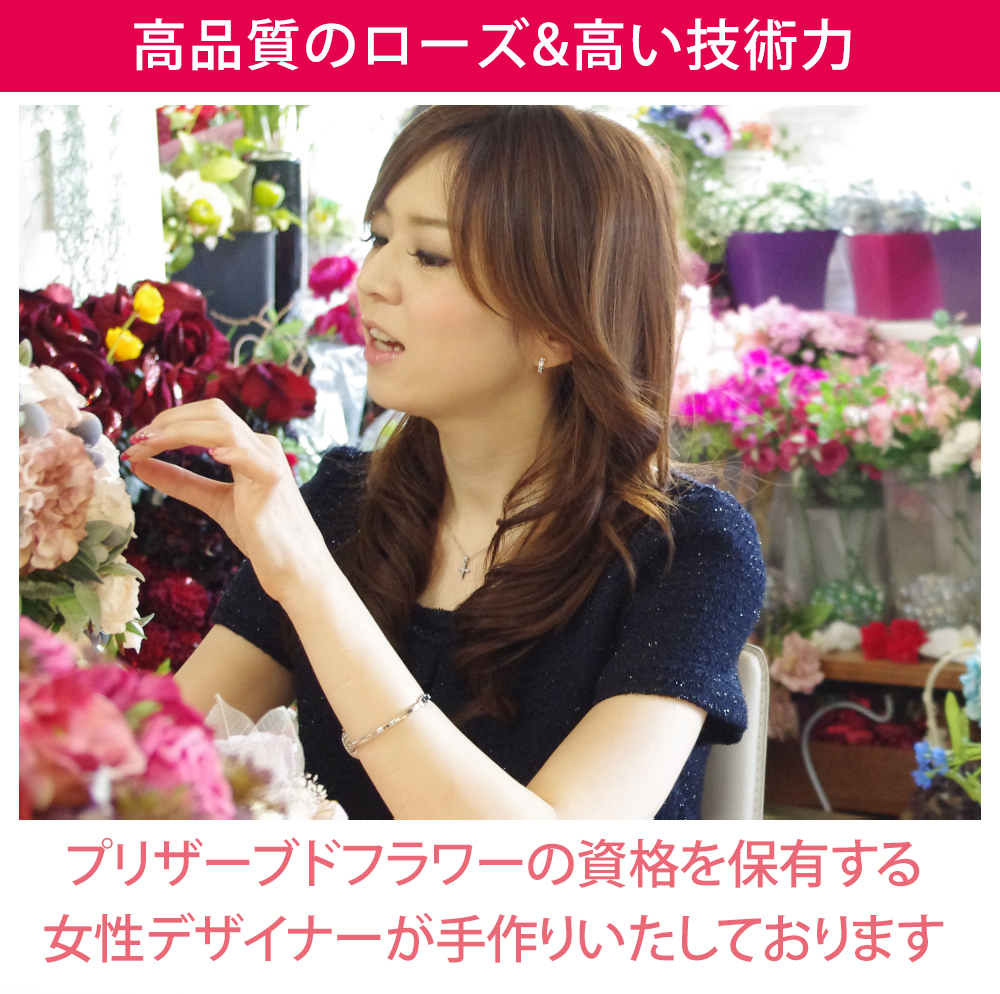 資格を持った女性スタッフが1つ1つ丁寧に作っている、IPFAのプリザードフラワー。IPFAとはプリザードフラワー協会の事で、技術を磨いた1000人以上の会員がいますが、その中でも最高の技術を持っている方がデザイナーとしてアレンジをしています。真心込めて作られているプリザードフラワーを大切な人に。