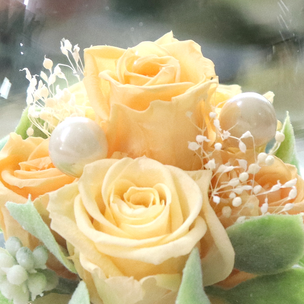 雪のようなパールビーズがキラキラとローズを取り巻きます。手のひらサイズだからこそ、主張しすぎず、どこにでも置きやすいのが魅力です。