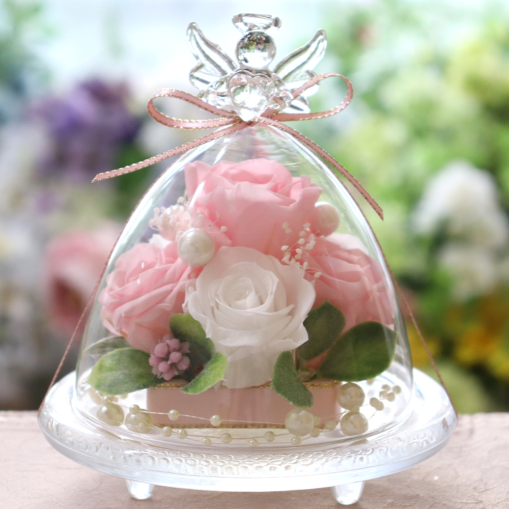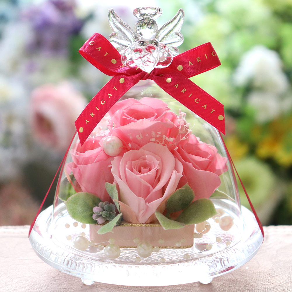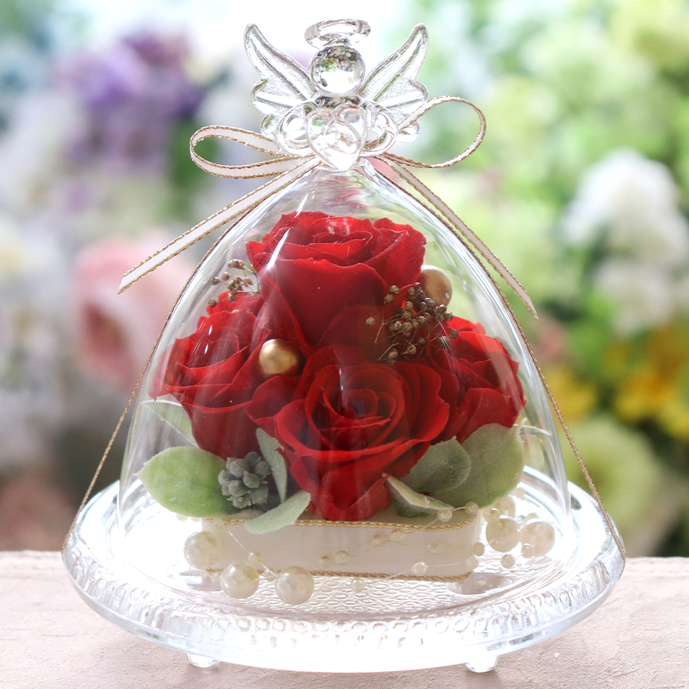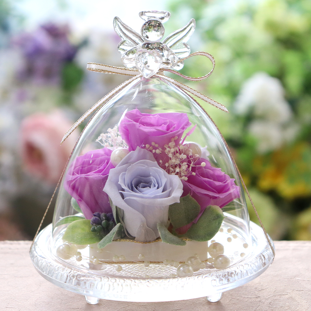 人気のガラスドームエンジェルのお花を、更にボリューミーにしたプレミアム。ガラスドームのトップには、ハートを持ったクリスタルエンジェルが輝きます。プリザーブドフラワーは水やりの必要がなく、半年~1年は充分綺麗な状態で楽しめます。お部屋に置いても可愛く、花粉も飛ばないため誕生日プレゼントなど特別な日の贈り物としておすすめです。