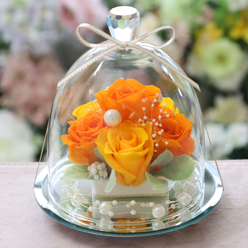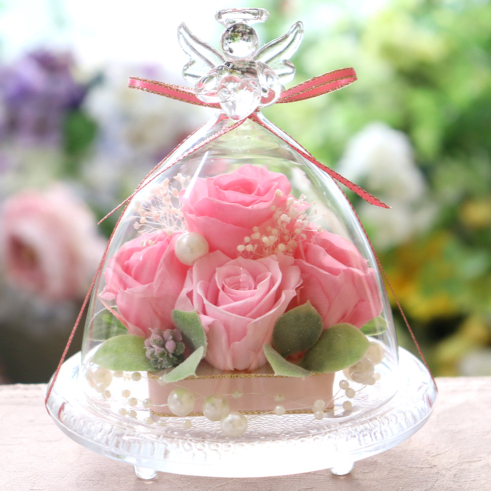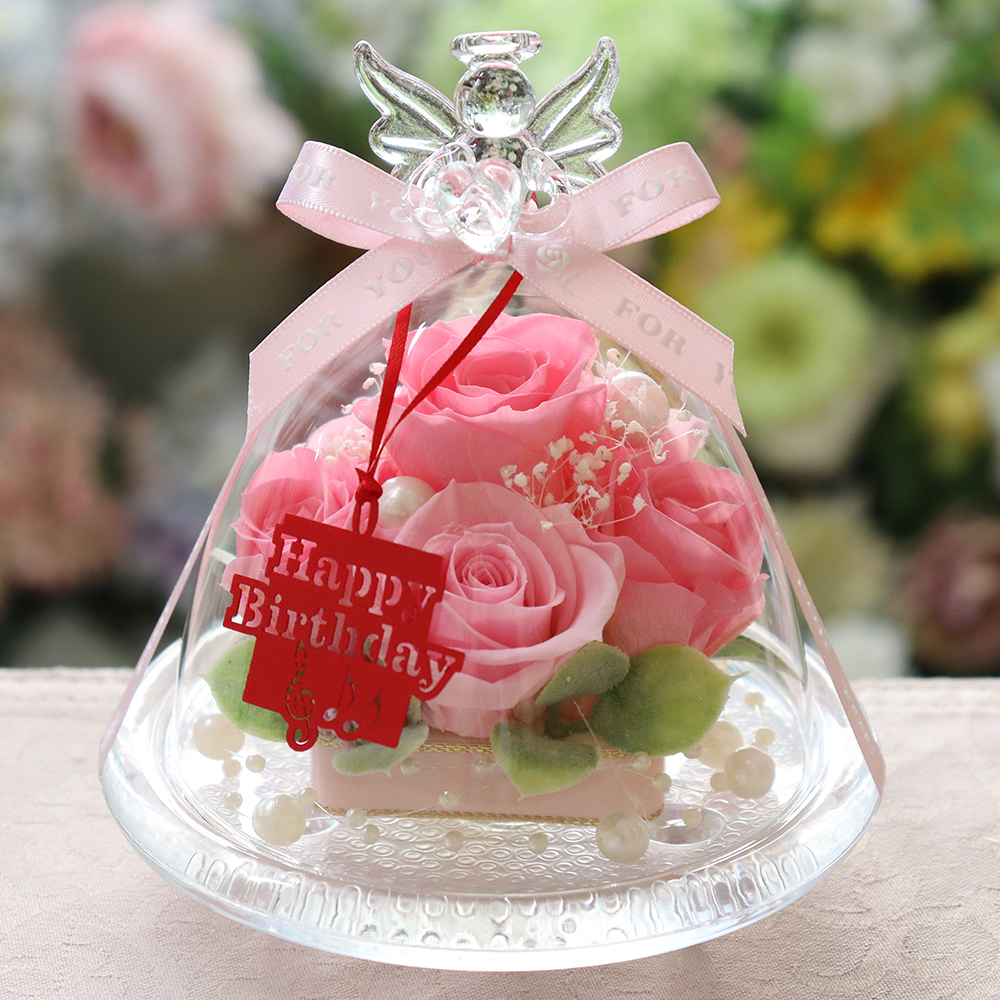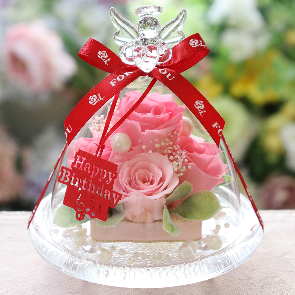 人気のガラスドームエンジェルのお花を、更にボリューミーにしたプレミアム。ガラスドームのトップには、ハートを持ったクリスタルエンジェルが輝きます。プリザーブドフラワーは水やりの必要がなく、半年~1年は充分綺麗な状態で楽しめます。お部屋に置いても可愛く、花粉も飛ばないため誕生日プレゼントなど特別な日の贈り物としておすすめです。
