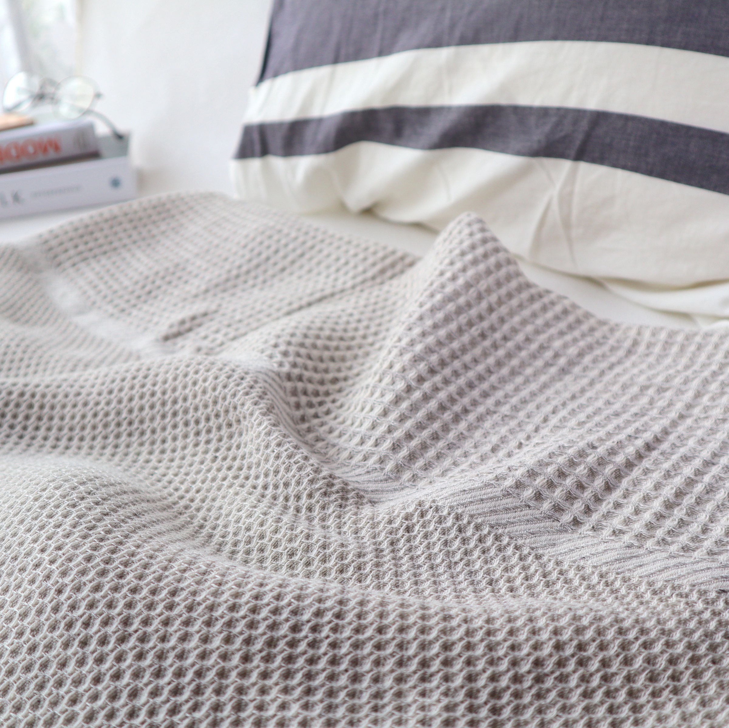 大口注文・法人のお問い合わせはこちら泉州南部織の代表作であるハニカム織とワッフル織を交互にデザインしたオシャレなブランケットは、寝具にはもちろんソファケットなどにも便利。 コットンの特徴であるふんわりと柔らかい肌触りとリネンは、独特のシャリ感を楽しめる高品質なケットです。 どちらの素材も吸水性・耐久性に優れており、長年使用してもくたりにくく使うたびどんどん柔らかくなります。 ナチュラルで落ち着いた印象になるようカラーにもこだわり、キナリ色とグレーの2色の高級感ある贅沢なカラーよりお選びいただけます。
