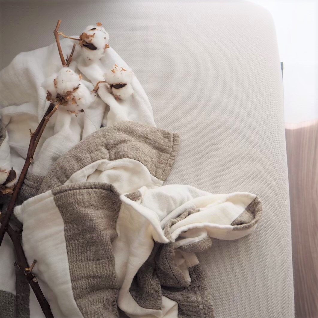 ダブルガーゼ織もしくはショートハニカム織2種類の生地による寝具です。天然素材であるコットンは、吸水性・吸湿性に優れており寝具に好まれて使用されております。また機能性だけでなく、柔らかく優しい触り心地の良さから古くから日本人に愛されている生地です。