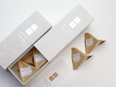 出し入れが簡単な引き出し式外箱の中に、 茶葉がそれぞれ三角テトラ型のパッケージに入っています。 シンプルなデザインでどなたにも喜ばれます。