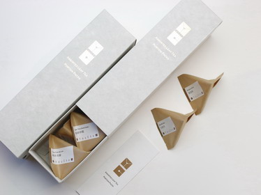 出し入れが簡単な引き出し式外箱の中に、 茶葉がそれぞれ三角テトラ型のパッケージに入っています。 シンプルなデザインでどなたにも喜ばれます。