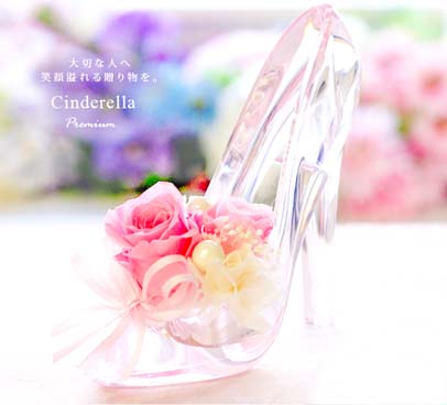 女性の憧れシンデレラとプリザードフラワーのコラボレーション。プレミアムは華やかな仕上がりになっています。プリザーブドフラワーは水やりの必要がなく、半年~1年は充分綺麗な状態で楽しめます。お部屋に置いても可愛く、花粉も飛ばないため誕生日など特別な日の贈り物として最適。女性なら一度は憧れたガラスの靴は絶対に喜ばれます!!