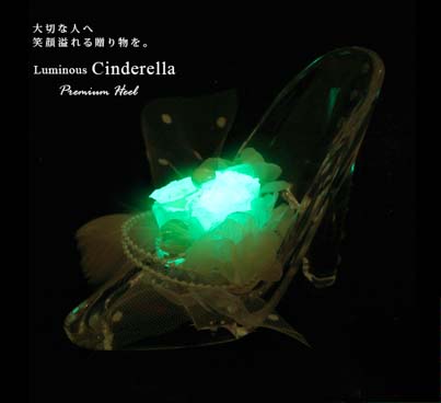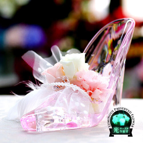 大口注文・法人のお問い合わせはこちらガラスの靴が光るという夢が詰まった商品。このプリザーブドローズは蓄光加工されており、30分~1時間程度蓄光すると、暗闇で幻想的に発光します。サプライズプレゼントには特に最適です。