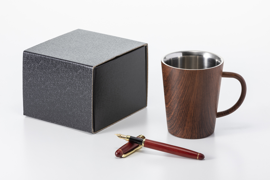 大口注文・法人のお問い合わせはこちらウッドデザインのマグカップと万年筆のセット。 外側の木目調デザインと鏡面仕上げをした内側のステンレス素材の光沢感、 金属と木のコントラストが落ち着いたドリンクタイムを演出します。