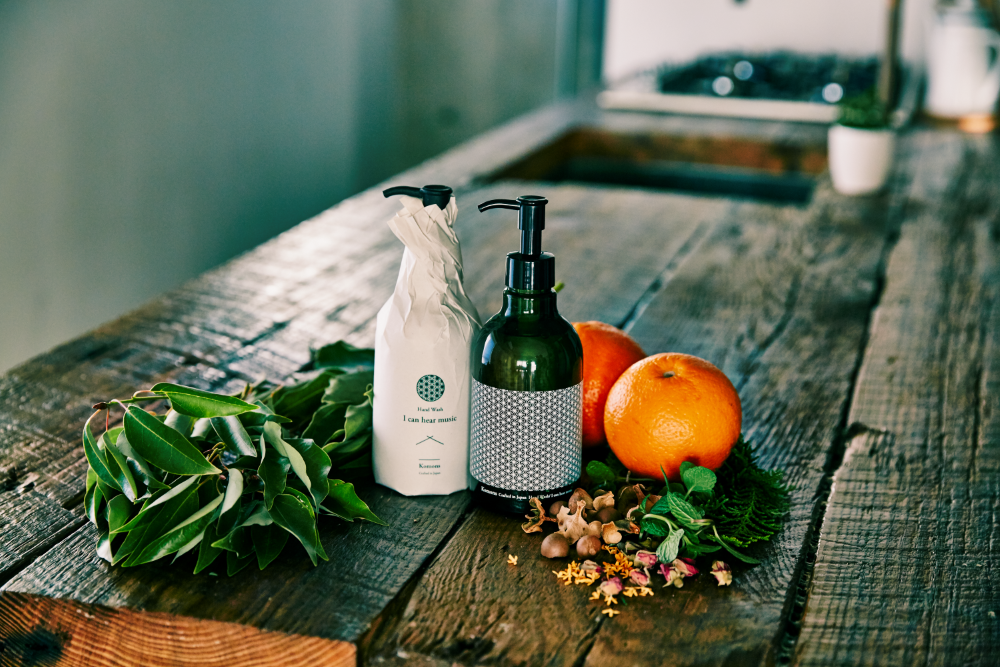 ハンドソープ 〜 I can hear music 〜 家に帰り、いちばん最初にする「手を洗う」という行為は、心も体もONからOFFへと切替えるスイッチ。 手を洗うたびに気持ちの良いメロディが流れるような香りと手触りのハンドソープを作りました。 <香り> ”ONからOFFへのスイッチ”をテーマに、Komonsの商品の中で最もリラックス感のある香りを目指しました。 爽やかなユーカリとベルガモットの後に、金木犀(オスマンサス)・ネロリ・ゼラニウムなどの花の香りが何層にも重なって感じられます。