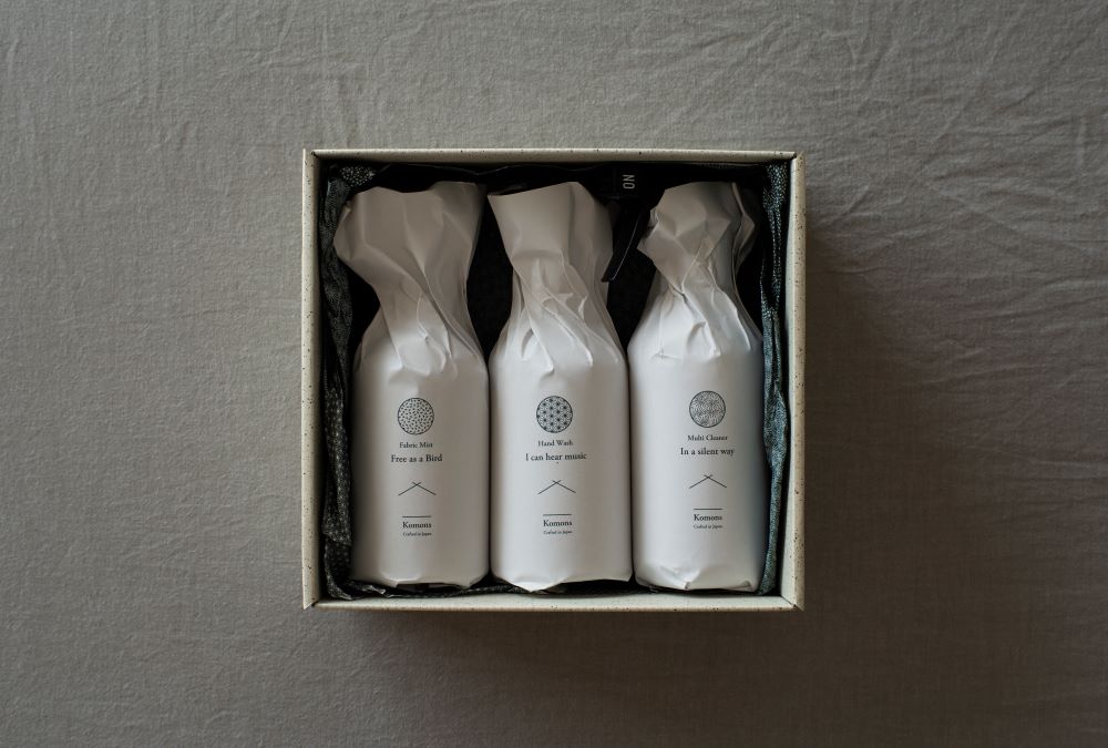 大口注文・法人のお問い合わせはこちらKomonsで人気アイテム3点セット。 癒しの香りを届ける「ハンドソープ」、「ファブリックミスト」、「食器用洗剤」のギフトセットです。 それぞれのアイテムの香りは、使うシーンに合わせて一つずつ異なるオリジナル。 高知ゆずや青森ヒバなどの和精油を含む、100%天然の香りです。 毎日の家事の時間をプラスに変える、使う度に豊かな気持ちになるように。 そんな想いを込めてつくった商品です。