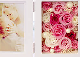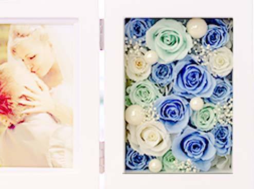思い出を飾るフォトフレームと長時間枯れないプリザーブドフラワーはまさにベストマリアージュ!フレームいっぱいにお花を敷き詰めました。プリザーブドフラワーは水やりの必要がなく、半年~1年は充分綺麗な状態で楽しめます。お部屋に置いても可愛く、花粉も飛ばないため誕生日プレゼントや母の日ギフト等、贈り物として最適。