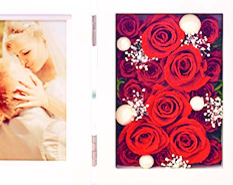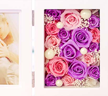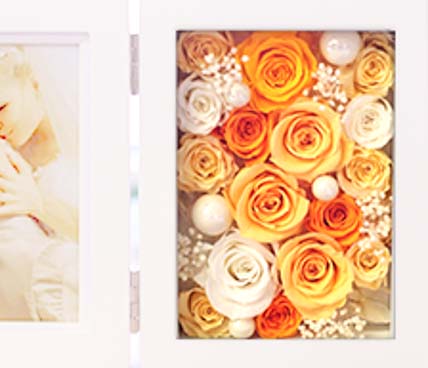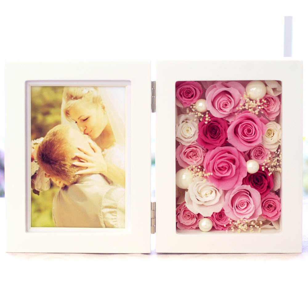大口注文・法人のお問い合わせはこちら微笑むような大切なお写真を、お花と一緒にお楽しみ頂けます。可愛いローズにパールのピックを添えて華やかにアレンジしました。ウェディングはもちろん、お祝いの贈り物としても目を引くアイテムです。閉じればコンパクトサイズになります。