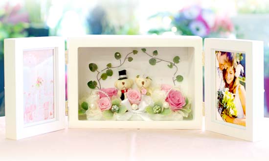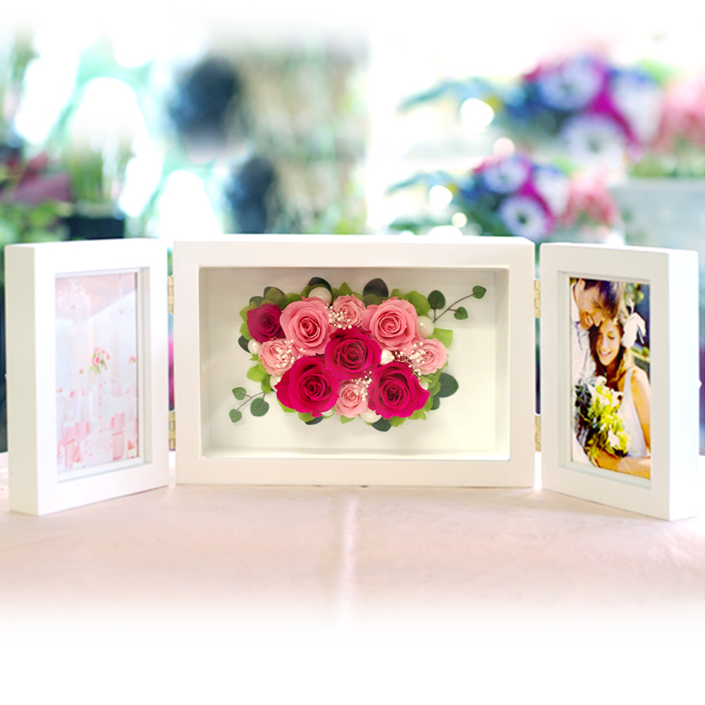 大口注文・法人のお問い合わせはこちら微笑むような大切なお写真を、お花と一緒にお楽しみ頂けます。可愛いローズにパールのピックを添えて華やかにアレンジしました。ウェディングはもちろん、お祝いの贈り物としても目を引くアイテムです。閉じればコンパクトサイズになります。