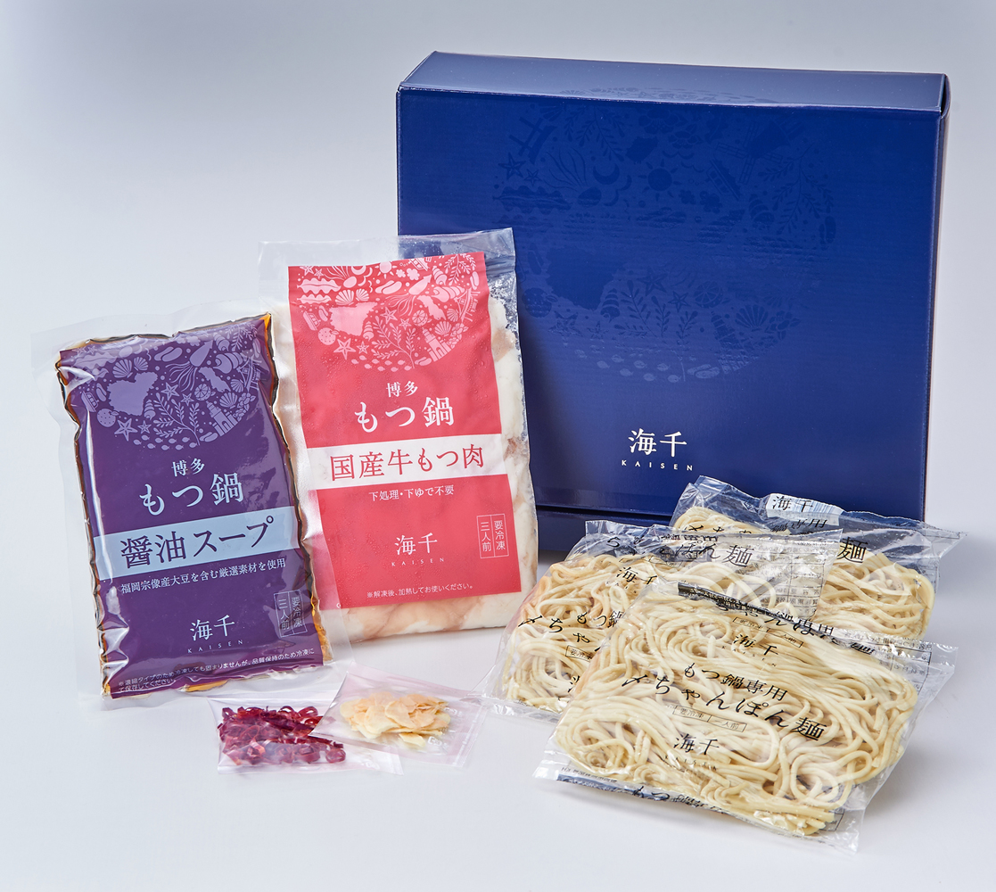 大口注文・法人のお問い合わせはこちらもつはぷるんっ!とやわらかで、噛むほどにもつの甘みや旨みが感じられる良質な国産牛もつの小腸のみを使用しています。 スープの決め手となる醤油には海千の地元、宗像産大豆を原料に使いもつの旨みを最大限生かすよう、少し甘めだけどくどくなく、ごくりと飲めるような特製スープに仕上げています。 お好みの野菜を入れるだけで本場の博多もつ鍋が手軽に楽しめます。 博多もつ鍋の〆はちゃんぽん麺がおすすめです。 コシのある麺とスープがよく絡み、最後のひとくちまでお楽しみいただけます。 野菜をたっぷりと食べられますのでヘルシーで意外にも女性ファンが多いもつ鍋です。