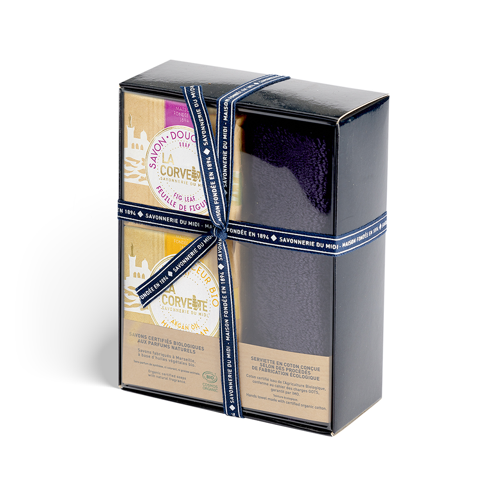 伝統的な製法によって本物のマルセイユ石鹸を製造し続ける「ラ・コルベット」が贈る、オーガニックソープとオーガニックコットンタオルを詰め合わせたギフトセットです。お肌と地球にやさしいオーガニック認証COSMEBIOを取得しています。