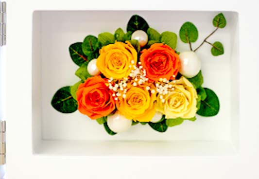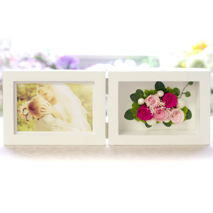大口注文・法人のお問い合わせはこちら微笑むような大切なお写真を、お花と一緒にお楽しみ頂けます。可愛いローズにパールのピックを添えて華やかにアレンジしました。ウェディングはもちろん、お祝いの贈り物としても目を引くアイテムです。閉じればコンパクトサイズになります。
