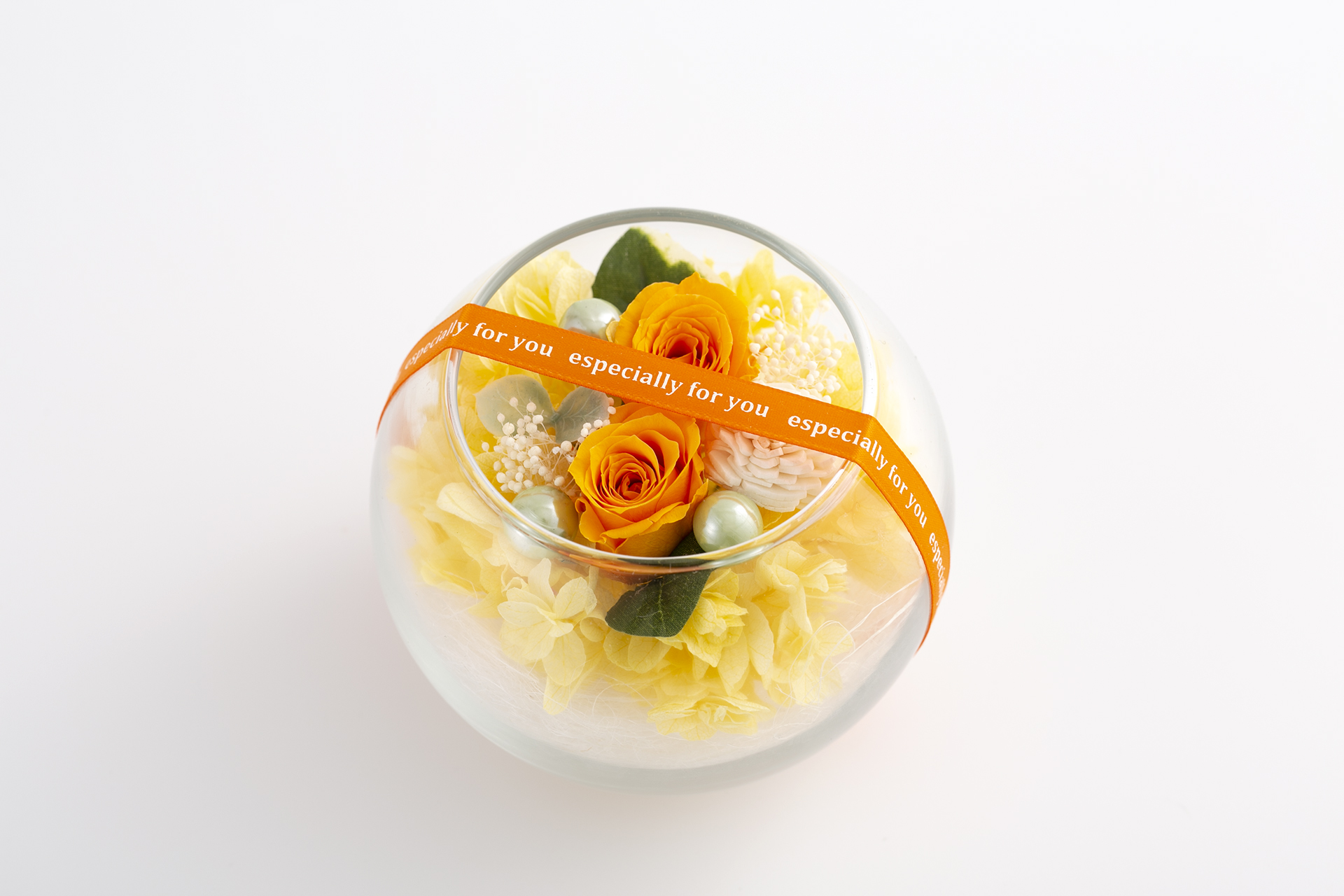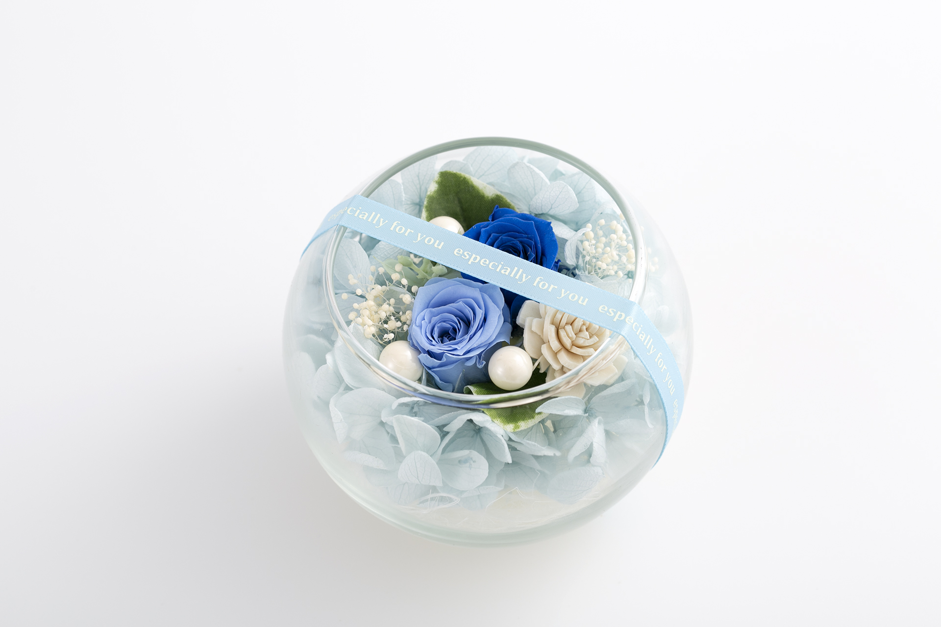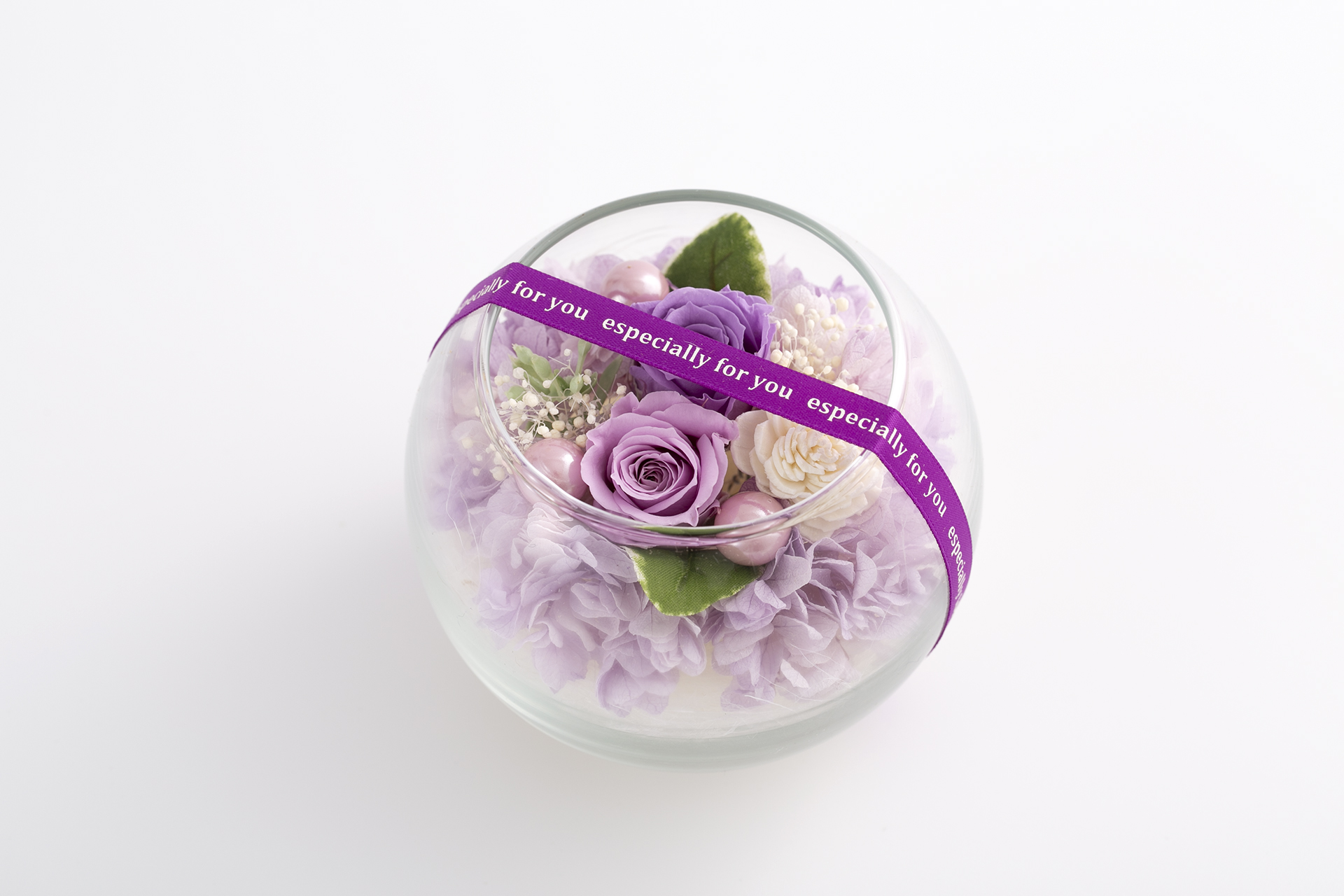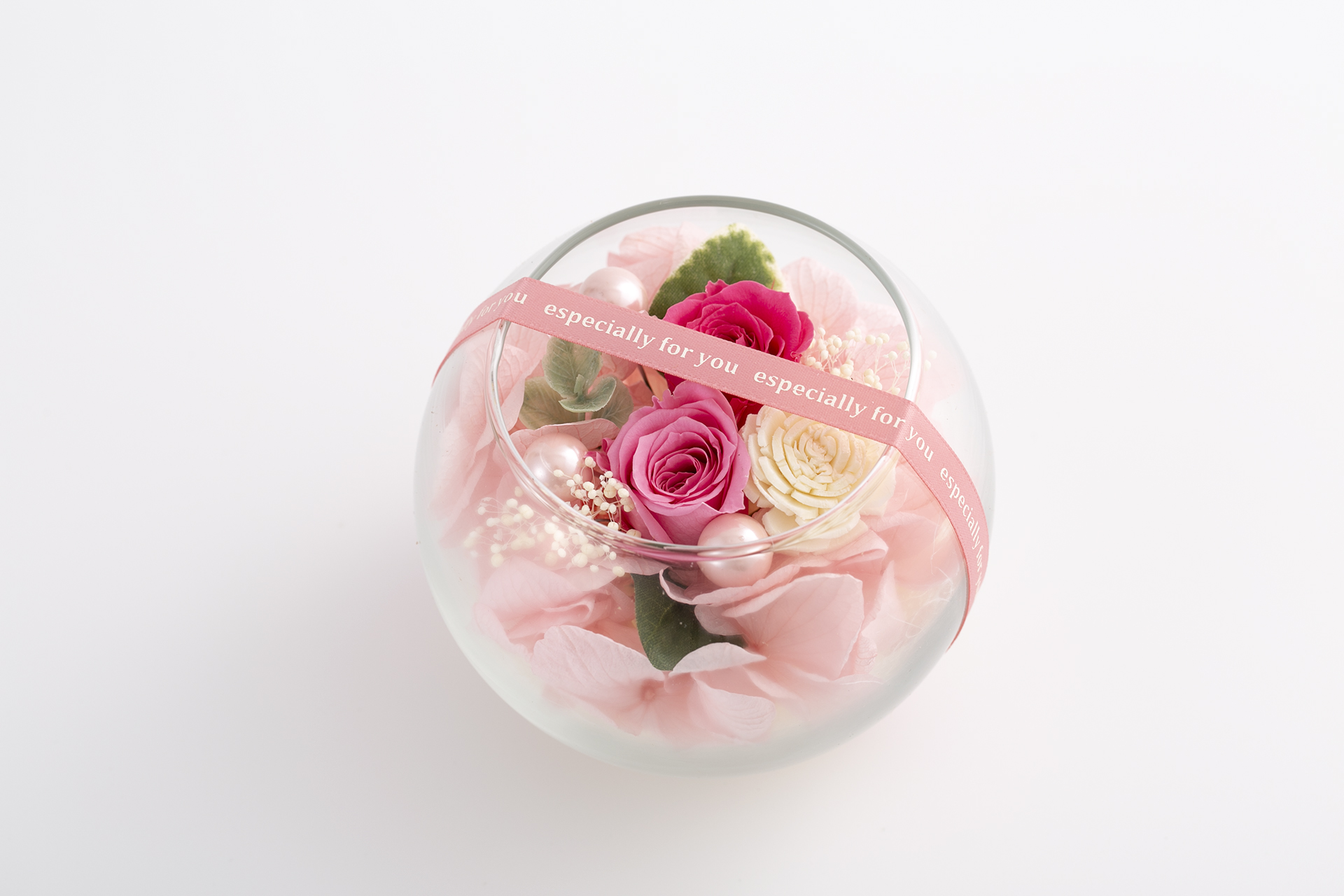 大口注文・法人のお問い合わせはこちら手のひらサイズのまんまるガラスにプリザーブドフラワーやアーティフィシャルフラワーのお花を一杯に閉じ込めた可愛らしいアレンジメントです。 花たちを透明感あふれるガラスドームの中へ。その美しい姿にうっとりします。 手のひらサイズながらもボリュームたっぷりで大切な方へのプレゼントにぴったりです。 球面のガラスが、お花をサイズ以上に大きく見せて、また光の反射で立体感を与えることにより、ボリュームたっぷりの商品に仕上がっています。 丁度良いサイズ感は、どんな場所でもさりげなくお花を演出出来るから、いろんな方へのプレゼントにもおすすめです。 6種類のカラーバリエーションで、相手や贈り物用途に合わせてお選び頂けます。 誕生日、結婚祝い、開店祝い、退職祝い、卒業祝い、母の日、クリスマスプレゼントなど様々な用途で喜ばれています。