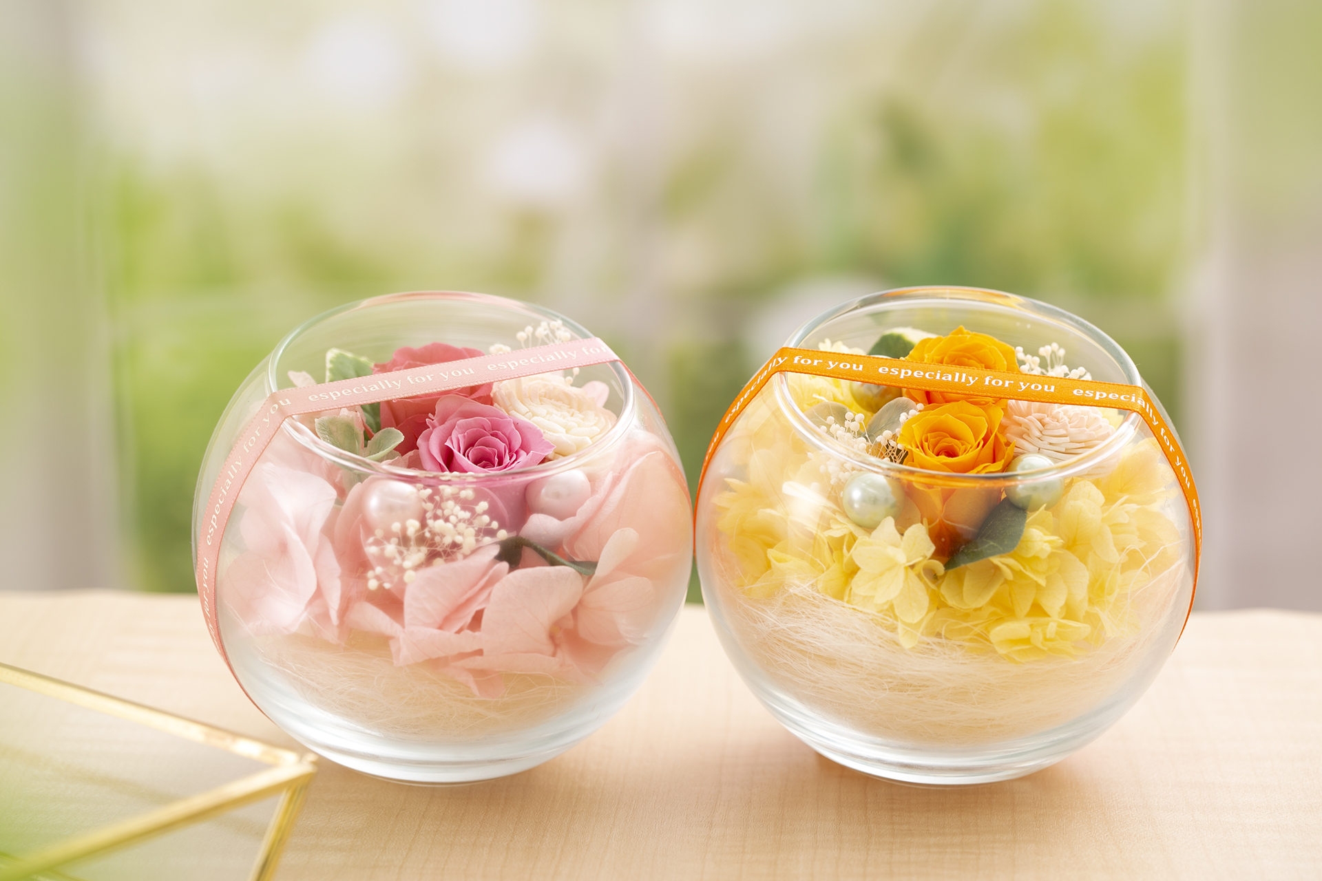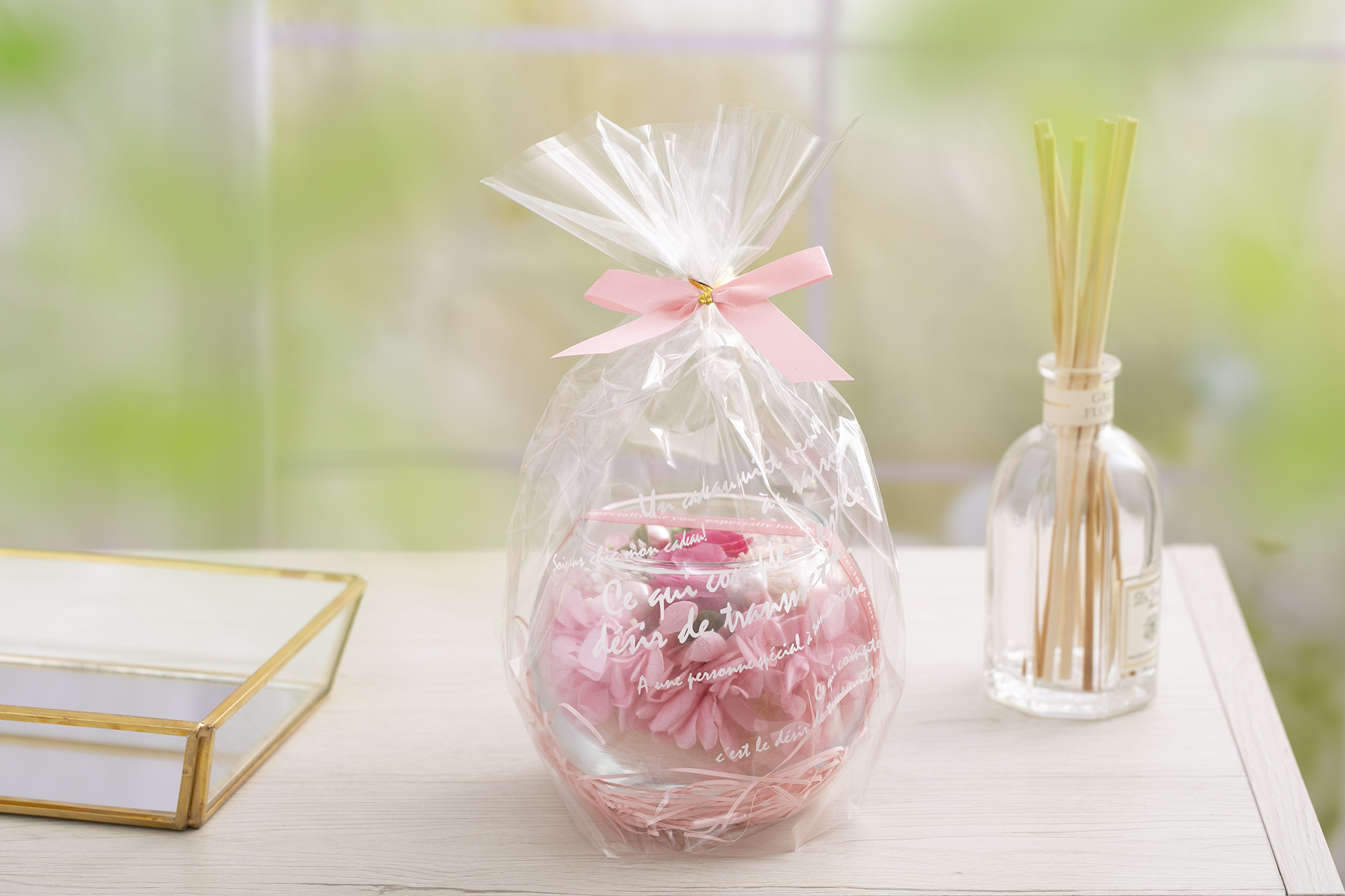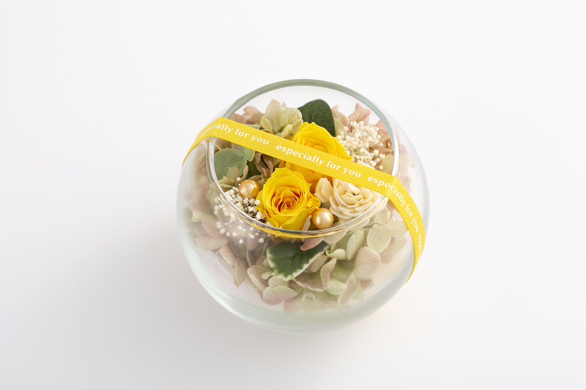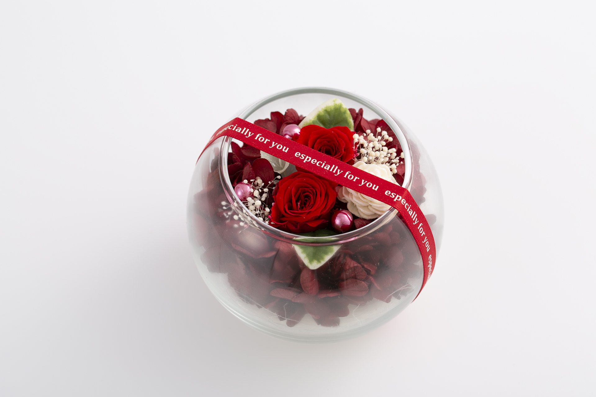 大口注文・法人のお問い合わせはこちら手のひらサイズのまんまるガラスにプリザーブドフラワーやアーティフィシャルフラワーのお花を一杯に閉じ込めた可愛らしいアレンジメントです。 花たちを透明感あふれるガラスドームの中へ。その美しい姿にうっとりします。 手のひらサイズながらもボリュームたっぷりで大切な方へのプレゼントにぴったりです。 球面のガラスが、お花をサイズ以上に大きく見せて、また光の反射で立体感を与えることにより、ボリュームたっぷりの商品に仕上がっています。 丁度良いサイズ感は、どんな場所でもさりげなくお花を演出出来るから、いろんな方へのプレゼントにもおすすめです。 6種類のカラーバリエーションで、相手や贈り物用途に合わせてお選び頂けます。 誕生日、結婚祝い、開店祝い、退職祝い、卒業祝い、母の日、クリスマスプレゼントなど様々な用途で喜ばれています。
