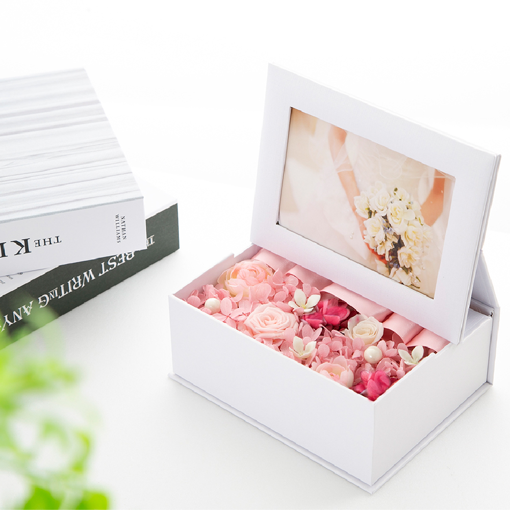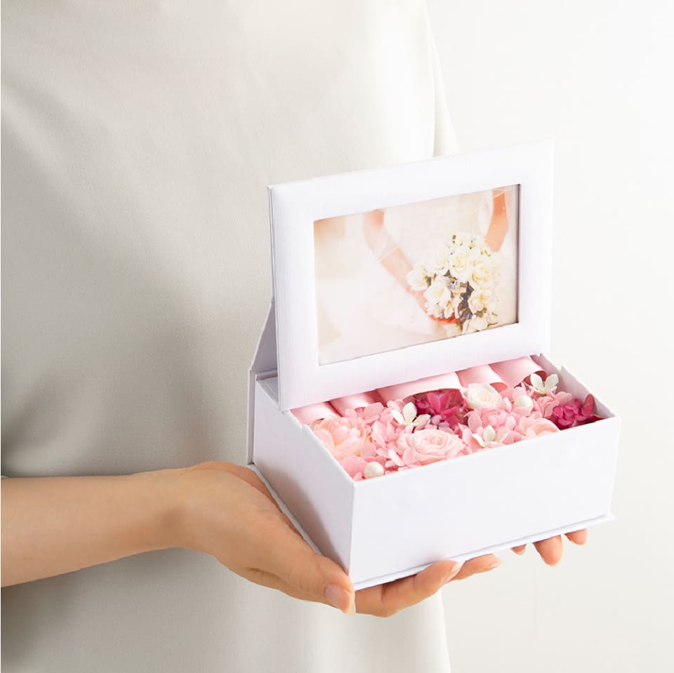 中身が見えるラッピングで、可愛らしい見た目になっていますのでプレゼントにもぴったりです。 大切な方へ、、 結婚式や誕生日、お祝い場所に。 様々なシーンに最適なプリザーブドフラワー 『photo flower box フォトフラワーボックス』はいかがでしょうか。