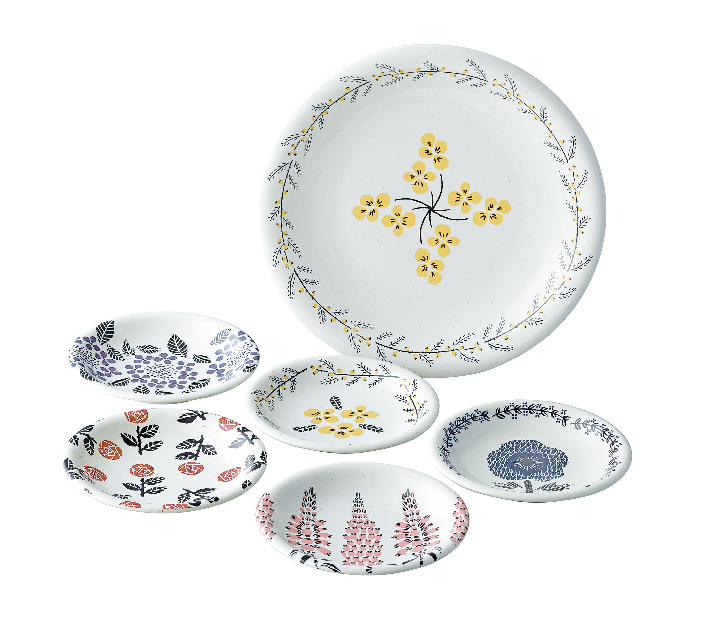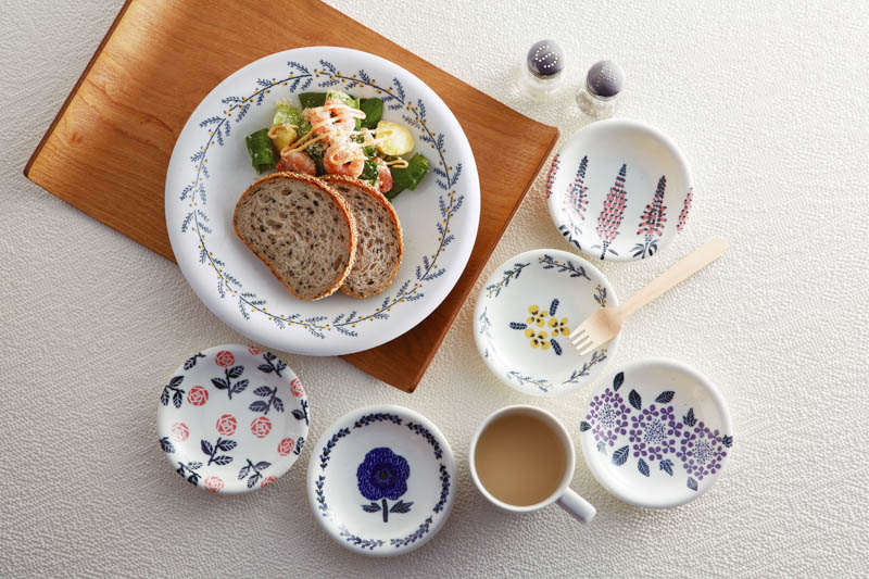 ”暮らしの中にお花を。”がコンセプトの【BOUQUETS(ブーケ)】から色とりどりのお花の絵柄がすてきな大皿と小皿のセットです。