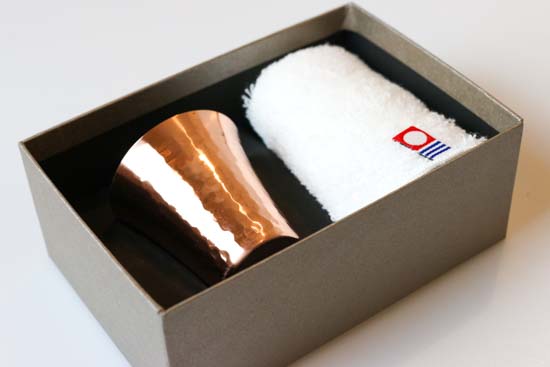 燕の職人の手による高度な加工技術で作られた冷酒カップは純銅製、ふわふわの今治タオルは「今治タオルブランド認定商品」です。
