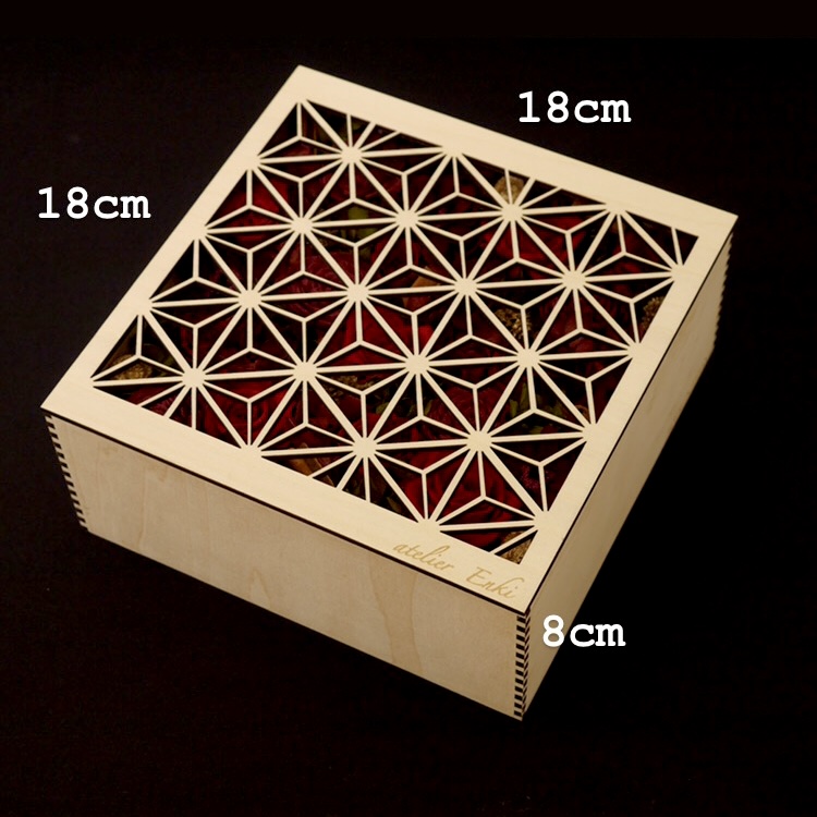 [情熱・愛情・美]という花言葉を持つ赤いバラをメインに使用したプリザーブドフラワーアレンジメントです。 箱に彫られた麻の葉の文様には邪気を払う性質があると言われていることから魔除けの意味が込められています。 麻は成長が早く丈夫であることから、すくすくと育つ縁起がよい模様とされ、その集合体の麻の葉は強い意味と美しさを兼ね備えたデザインとなっております。