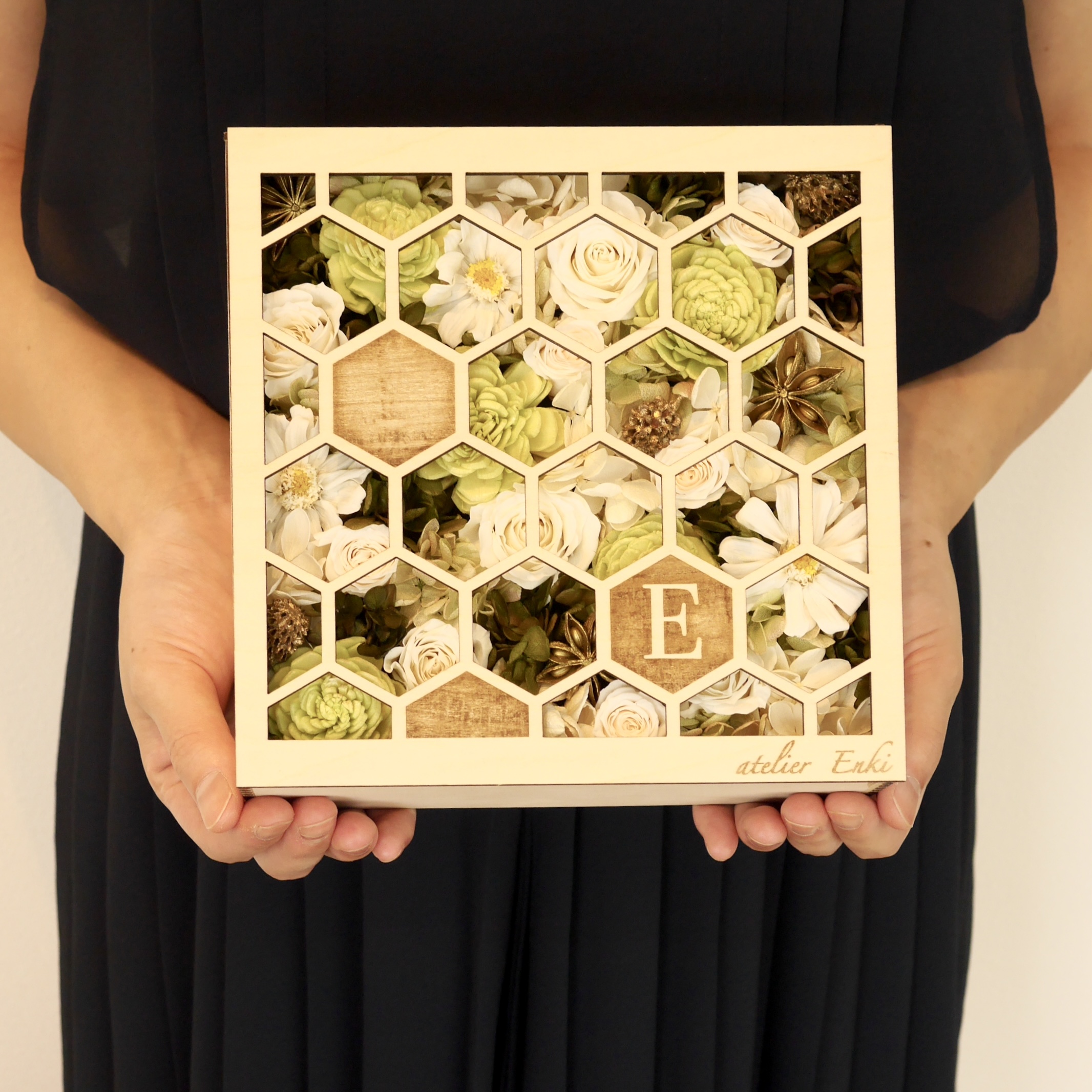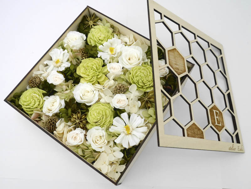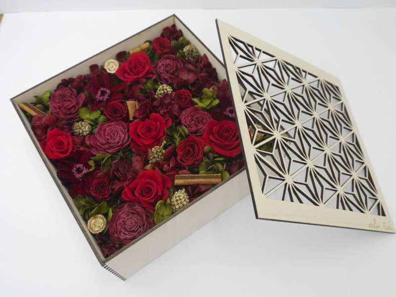フラワーデザイナー「Masahide Maeda」により、『花できっかけをつくる』をコンセプトに立ち上げられたブランドの、【atelier Enki】限定プリザーブドフラワーです。箱にはカラーごとに願いや想いが込められた縁起の良い柄が掘られています。