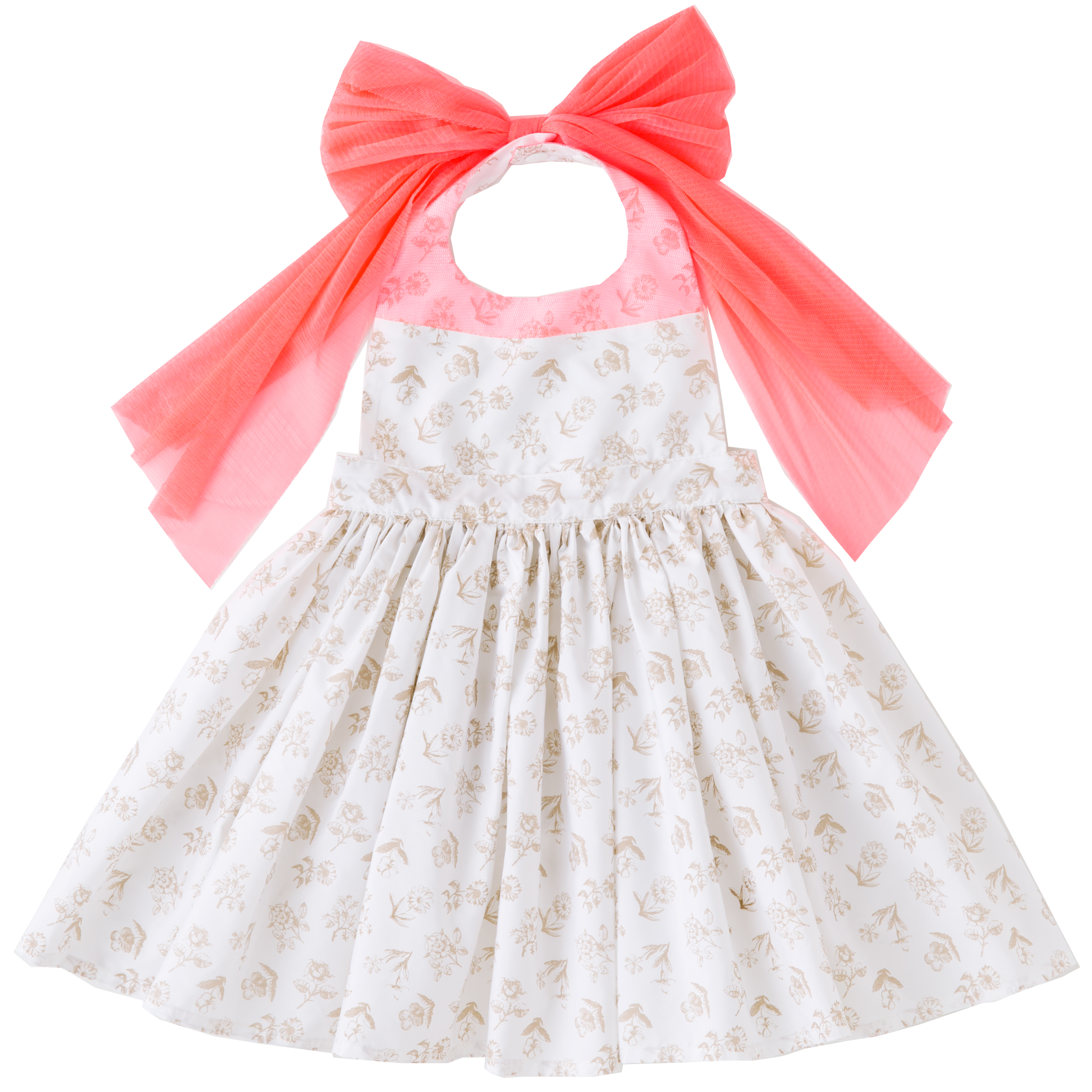 ホワイト地に広がる上品な小花柄は、このエプロンのために描かれたマールマールのオリジナル。ネオンピンクのリボンで、後ろ姿もキュートに。