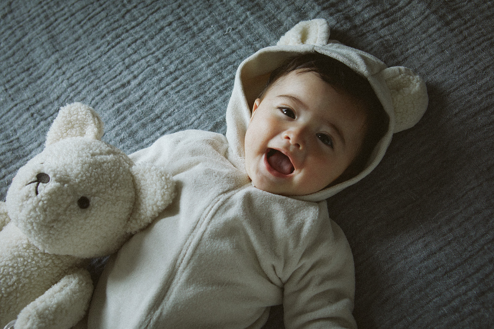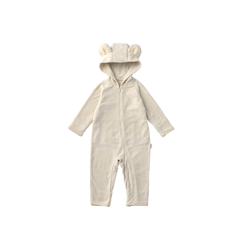 子守歌のようにやさしく子どもを包み込み、寝姿をかわいく演出するクマ耳がキュートなオールインワンナイトウエア。