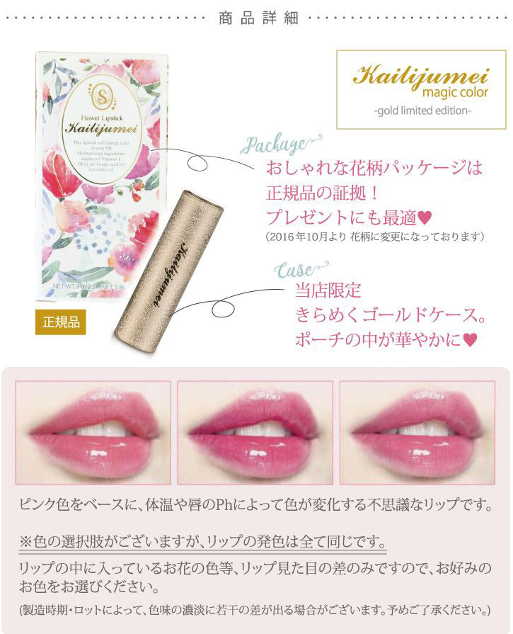 大人気の「Kailijumei(カイリジュメイ)」のフラワーティントリップより、高品質な日本限定ハイエンドモデルです。天然成分をそのまま配合しました。ティントリップなので色落ちしにくく、自分だけの色に染まります。シンプルなゴールドケースは年代を選ばず使いやすいデザインです。