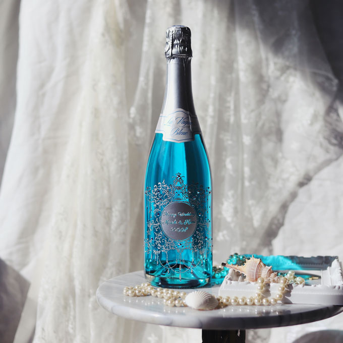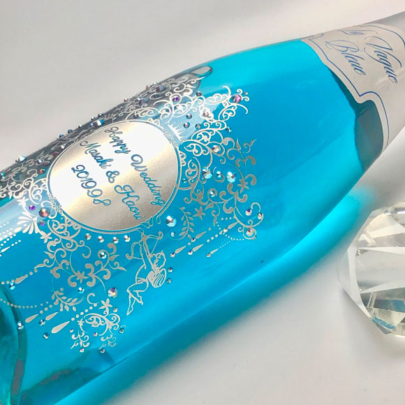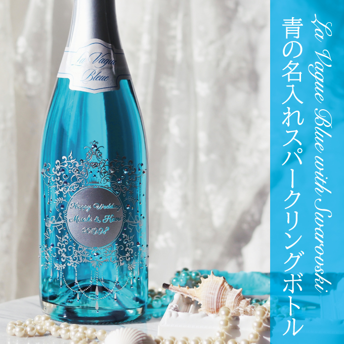 大口注文・法人のお問い合わせはこちら「ラ・ヴァーグ・ブルー」とは“青い波”の意味です。 フランスでは『幸せを呼ぶ青いボトル』と呼ばれ様々な祝事に利用されています。 ギフトサロンセリジエではこのボトルに細かな砂でひとつひとつ丁寧に彫刻し、スワロフスキーを装飾。 各記念日に感動を贈る美しいギフトです。 結婚式やお祝い事にぴったりの美しいブルーのスパークリングワインにクリスタルがきらめきます。